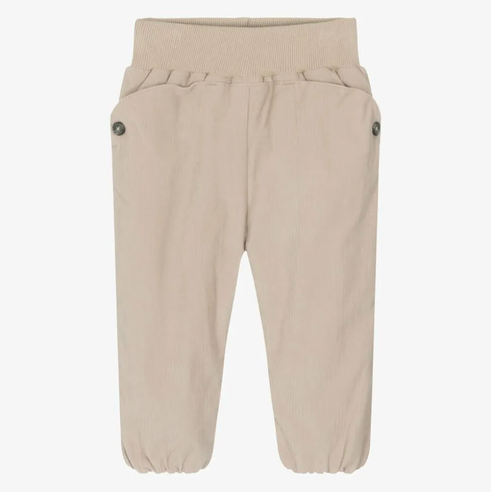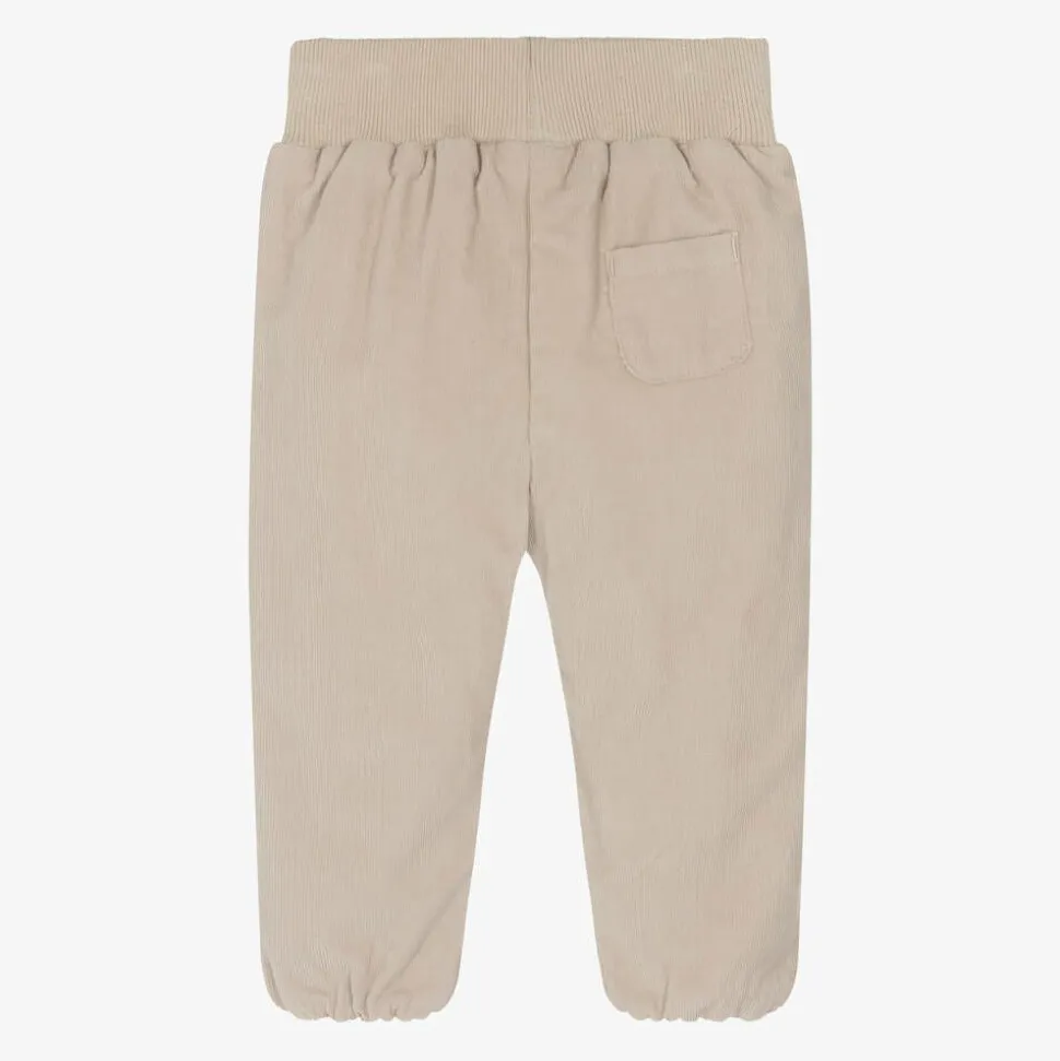 Beige trousers for baby boys by French brand Tartine et Chocolat, made in fine cotton corduroy. They are lined in soft and comfortable cotton jersey, with a ribbed elasticated waistband for easy pull on. The front pockets have a sweet button detail, and the ankle cuffs are gently elasticated for a snug fit.