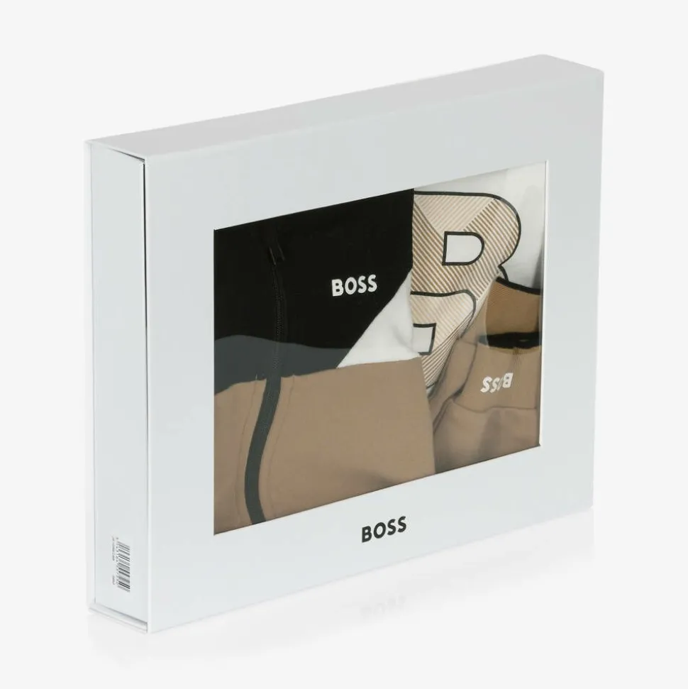 In beige, white and black, this soft organic cotton jersey tracksuit set for baby boys is by BOSS. The zip-up top has a cosy fixed hood, ribbed trims, and a white logo print on the chest. The joggers have a comfortable elasticated waist, with a matching logo print on one leg. A white long-sleeved top, with helpful shoulder poppers and the brand's Double B monogram on the front, completes the sporty look. Coming in a branded gift box, the set makes an ideal present for a new arrival.