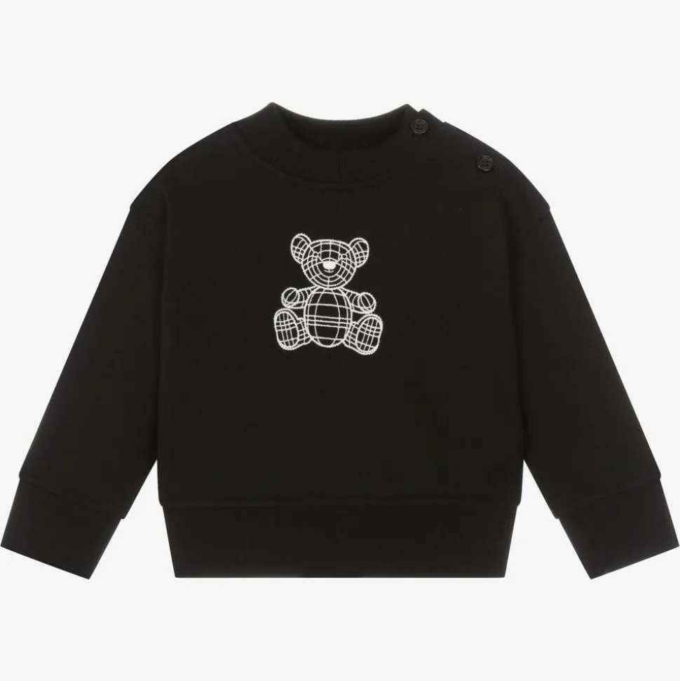 Black sweatshirt for baby boys by luxury British brand Burberry, with an embroidered white Thomas Bear design on the front. Made in soft mid-weight organic cotton jersey, it has a classic fit, ribbed trims and button fastenings on one shoulder for easy wear. A black rubberised logo patch on the back completes the designer look.
