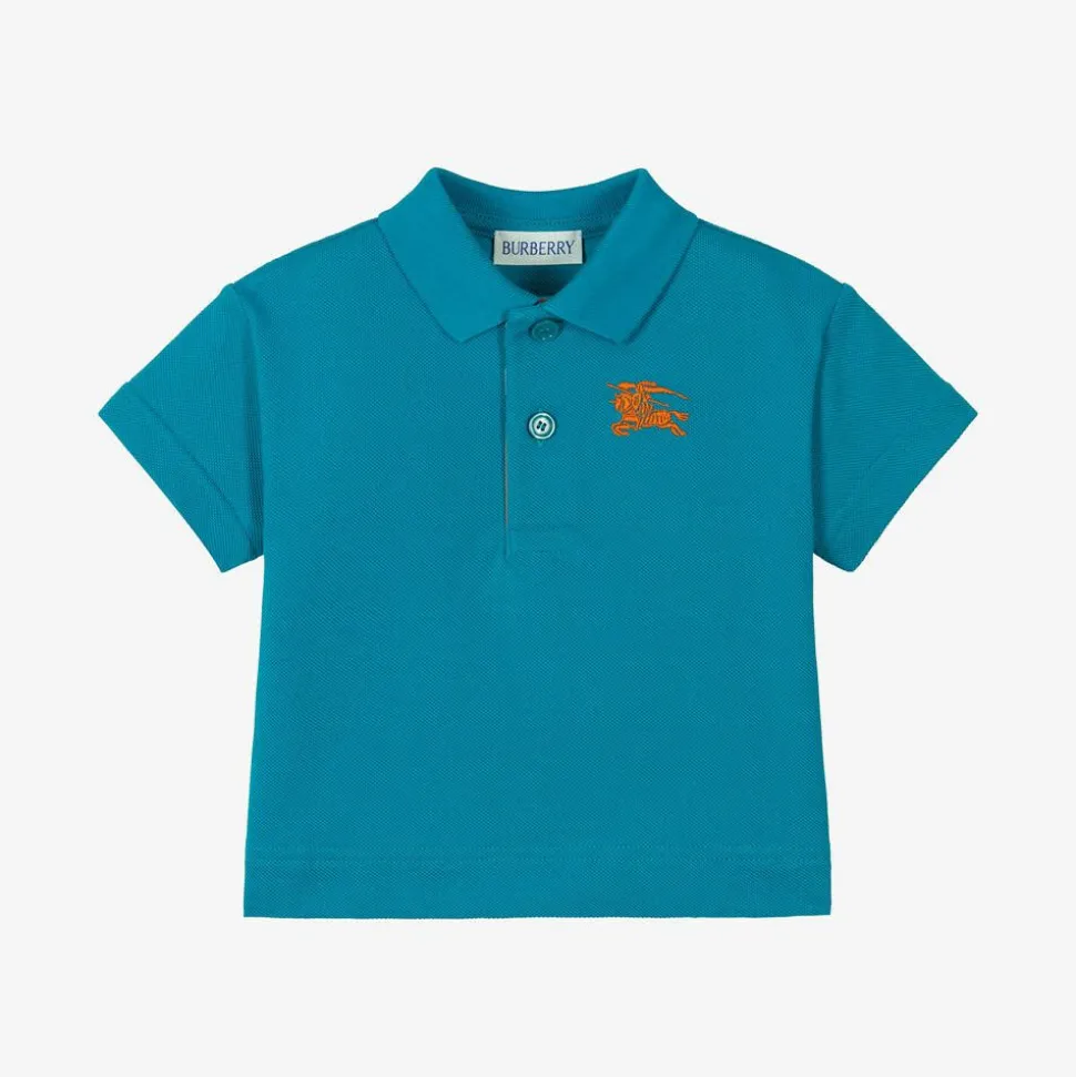 From British luxury label Burberry, a classic polo shirt for baby boys in a lovely kingfisher blue shade. It is made in soft cotton piqué with a ribbed collar and button fastenings. For designer appeal, the brand's Equestrian Knight Design is embroidered in orange on the chest and the signature beige check is concealed beneath the button placket.