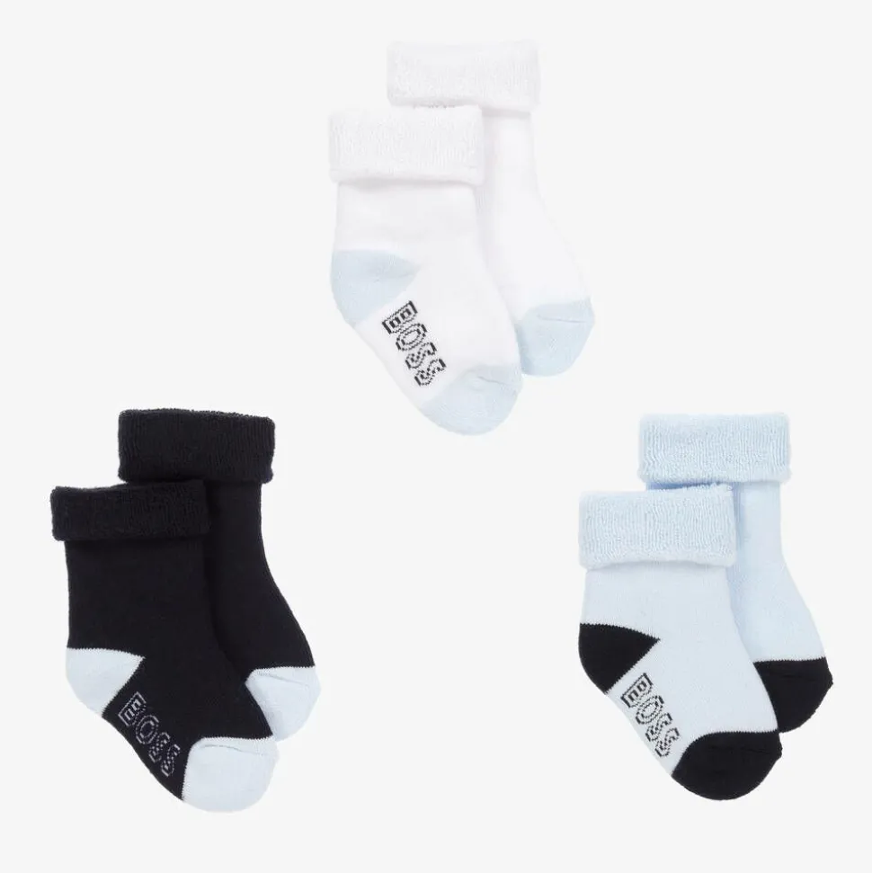 Navy blue, white and pale blue socks for baby boys from renowned clothing label BOSS, in a handy pack of three pairs. Comfortable for the smallest of feet, these jersey socks are made in a soft cotton mix with a terry towelling underside for absorbency. They have contrast-coloured trims and the designer's name written on the soles.