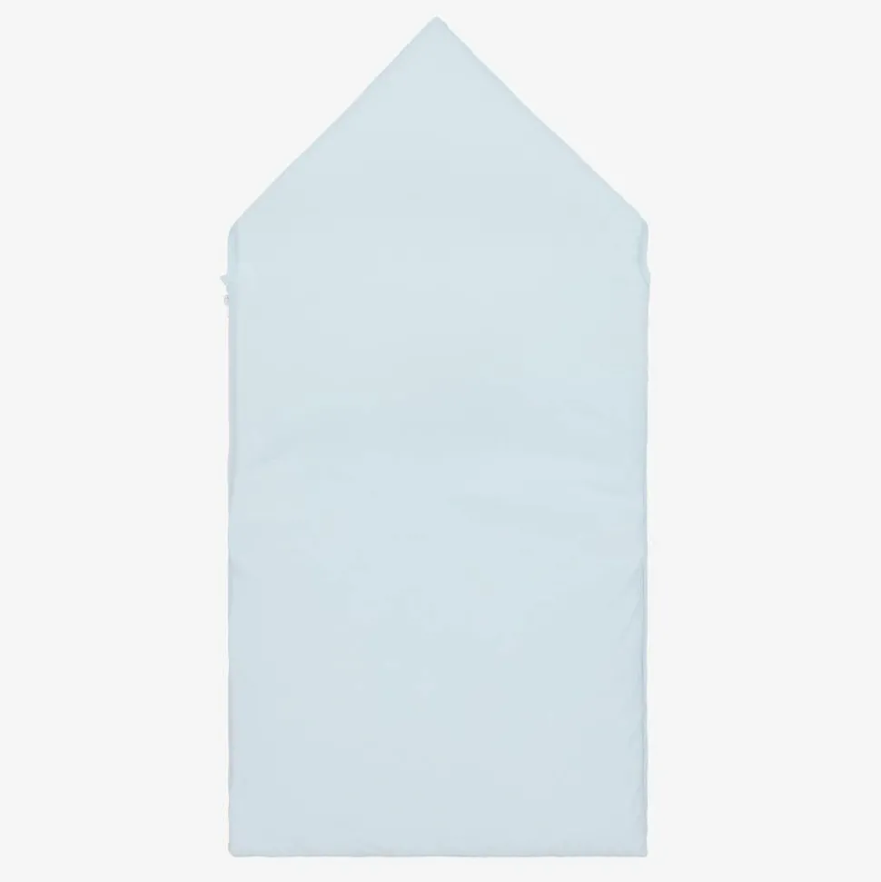 Lovely pale blue Pima cotton nest for baby boys by Kissy Kissy, an exclusive to Childrensalon. Beautifully soft to the touch and lightly padded for cosy comfort, this 3-tog jersey nest has a side zip fastening. There is an adorable blue train motif hand embroidered on the white front panel. The hood can be laid flat when the poppers are unfastened.