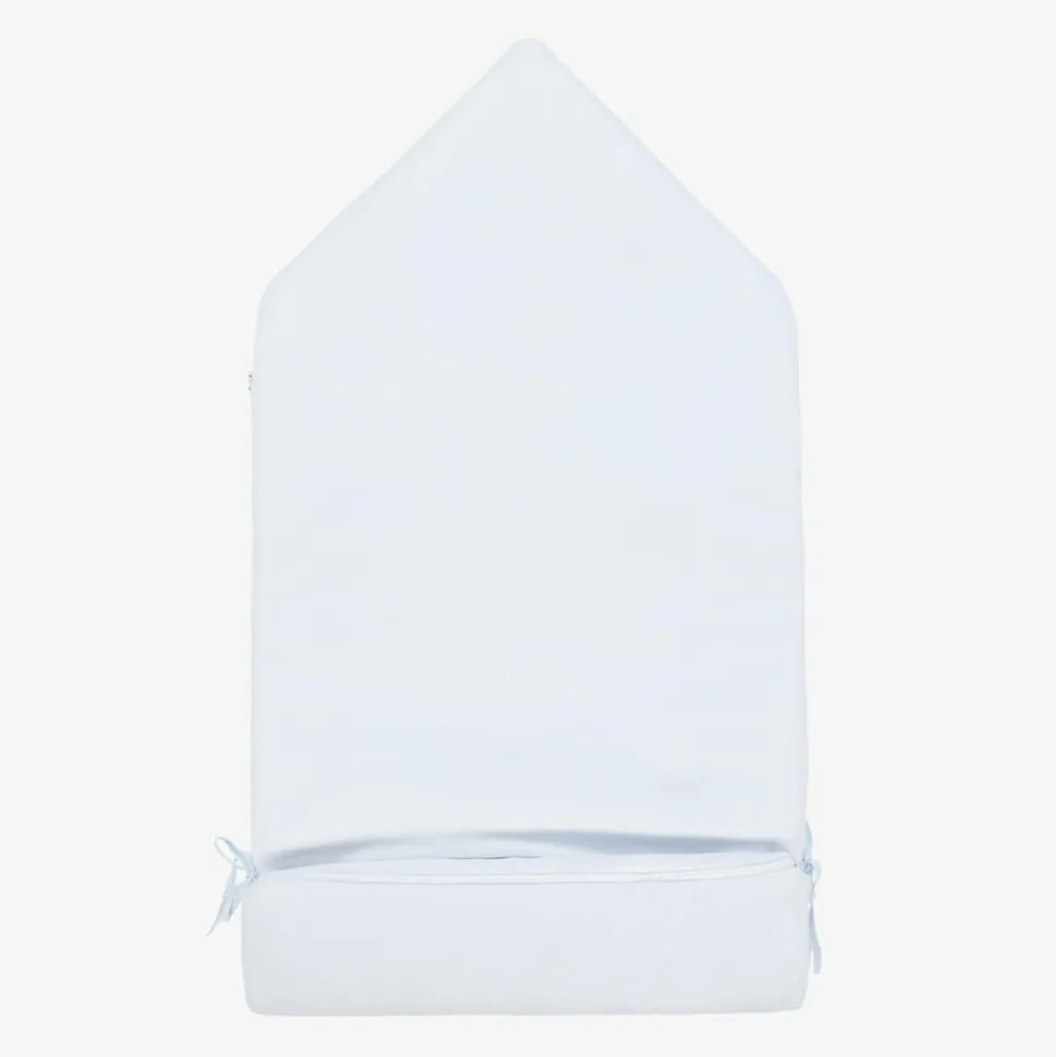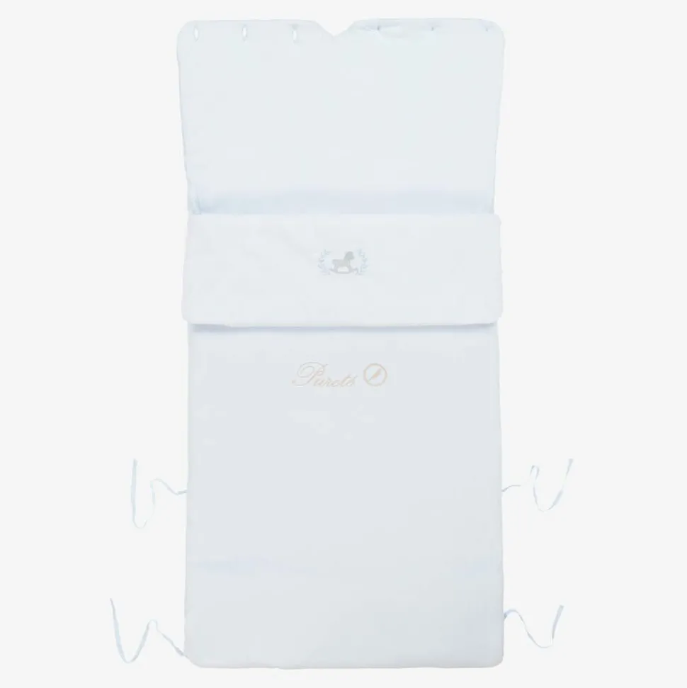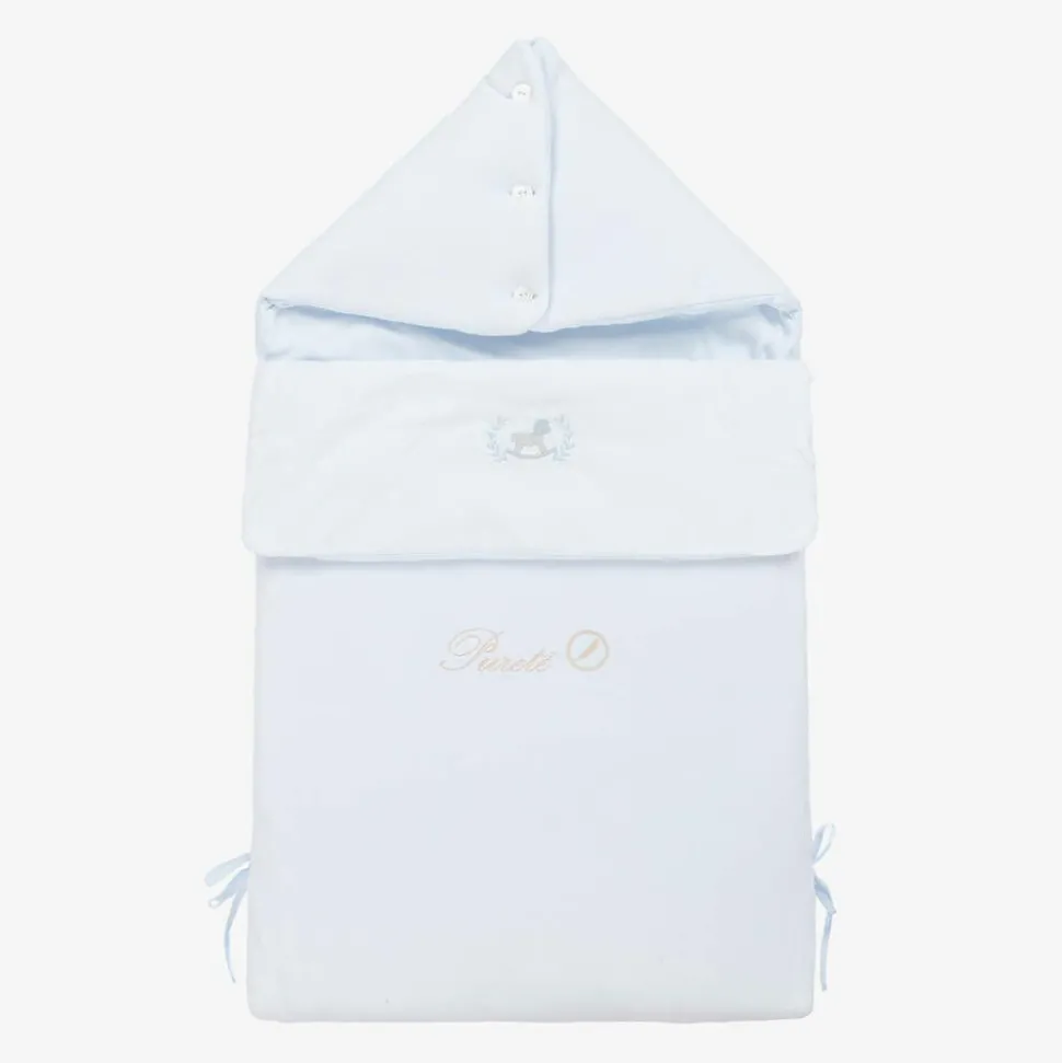 Exclusive to Childrensalon, this lovely pale blue nest for baby boys is by Pureté Du… Bébé. Cosy and warm, it is made in super soft velour with a cotton jersey lining and lightweight padding. The lightweight twill front panel is embroidered with a cute rocking horse and beige logo embroidery can be seen on the front. It secures with a zip along one side and across the base, with buttons on the hood and ties at the bottom to adjust the length. When unfastened it creates a comfortable, flat surface to lay baby on.