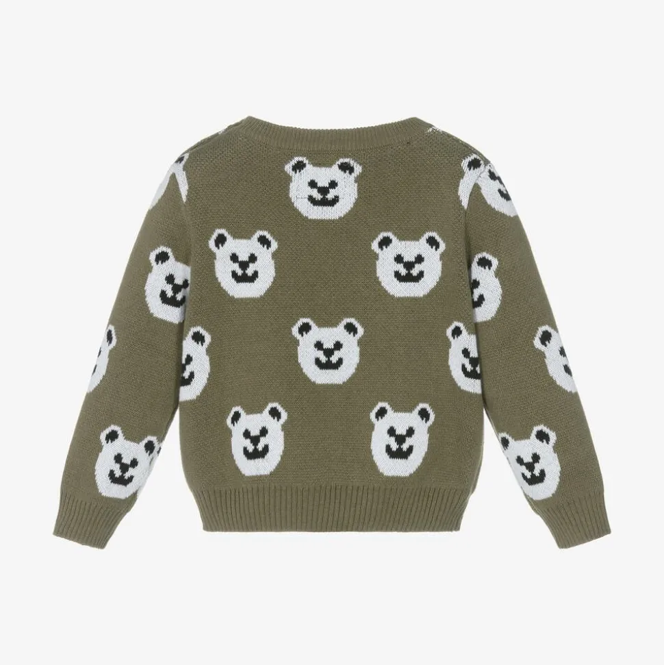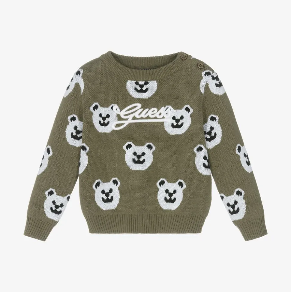 Khaki green sweater for baby boys by Guess, knitted with cotton for softness and comfort. This cute design is patterned with white bears and embroidered with the brand's name across the chest. It has ribbed trims and button fastenings on one shoulder. This item contains organic cotton fibres.