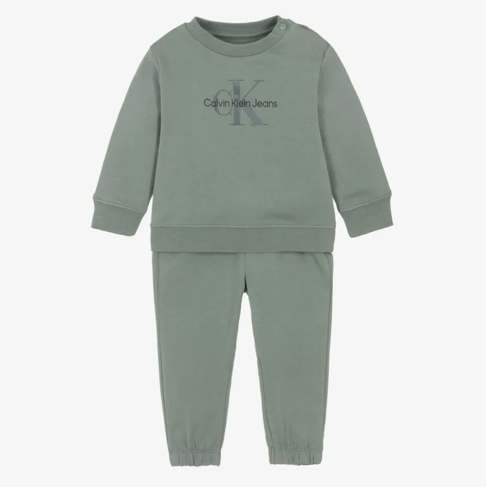 Smoke green tracksuit for baby boys by Calvin Klein, made in soft and stretchy cotton jersey. The comfortable sweatshirt, with a mid-weight feel, has a Calvin Klein Jeans logo and monogram print on the front. There are practical popper fastenings on one shoulder for easy dressing. The matching joggers have a functional drawstring waistband and elasticated cuffs for added comfort. This item is made with at least 95% certified organic cotton.