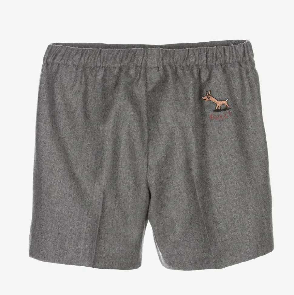 Baby boys smart grey shorts by luxury brand Gucci, made in soft wool and cashmere flannel. They have an orange embroidered logo mythical animal patch on the back by UK children's illustrator Freya Hartas. Fully lined, they have an elasticated waistband for easy dressing and front pleats.