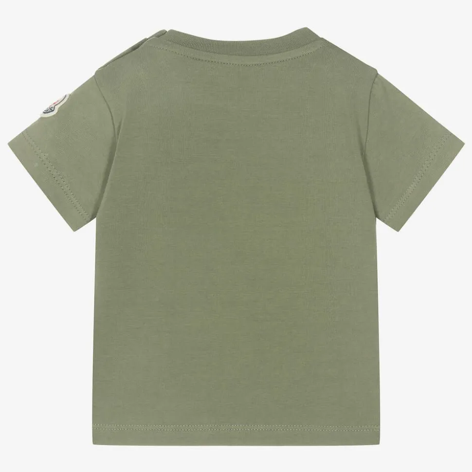 Khaki green cotton short-sleeved T-shirt for baby boys by luxury brand Moncler Enfant. The designer's name can be seen on the front in white tape-style print, with their iconic felt logo badge sewn on one sleeve. Made in comfortable jersey, this casual tee has shoulder popper fastenings to help with dressing.