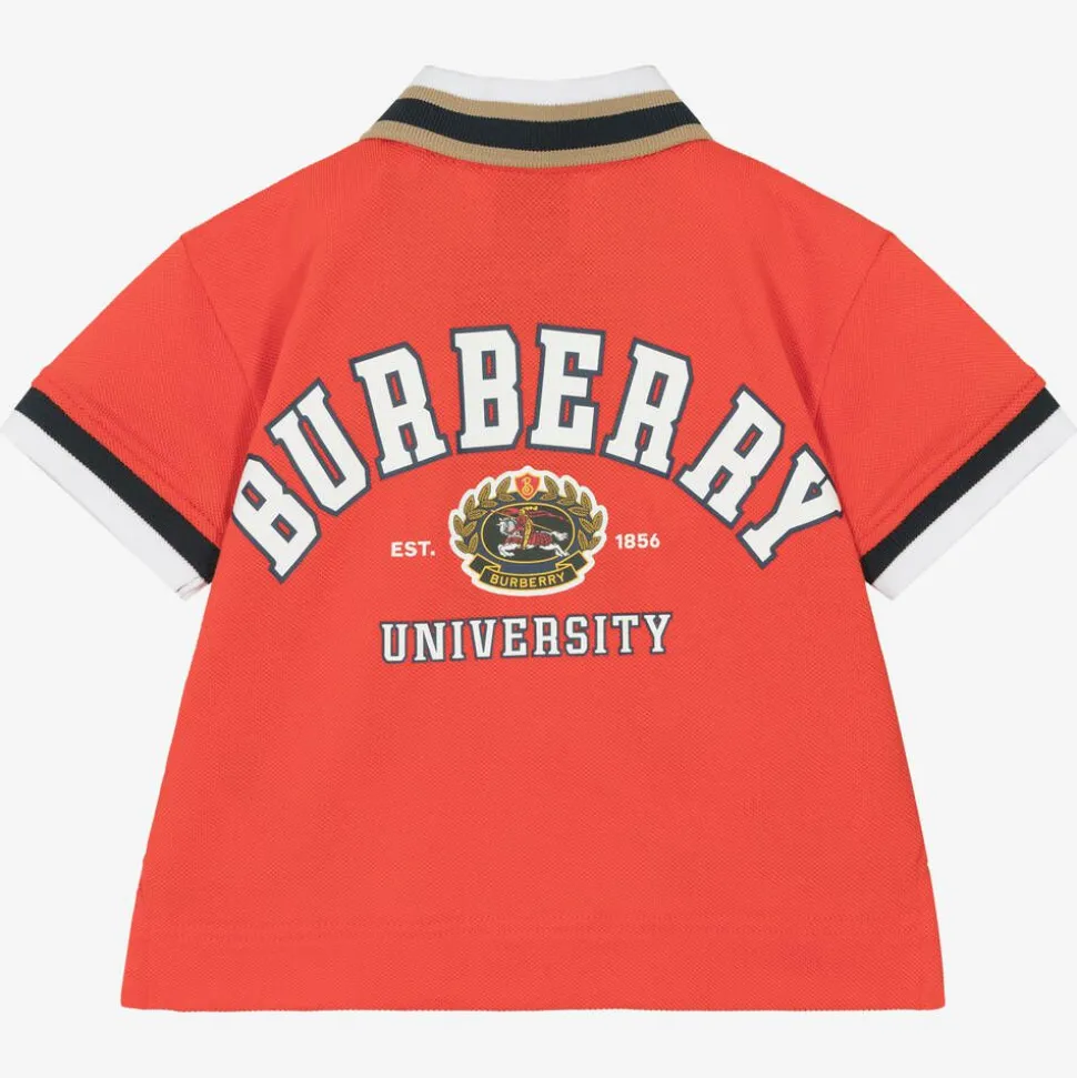 Bright red, college-inspired cotton polo shirt for baby boys unmistakably by luxury British brand Burberry. It has the Burberry University logo printed on the back in white and navy blue, incorporating the signature Equestrian Knight Design and oak leaf crest. Made in comfortable, breathable piqué, it has ribbed trims striped in beige, white and navy blue, with a contemporary, wide, navy blue, buttoned placket. There are side vents on the hemline, which is longer around the back than the front. This product contains organic cotton.