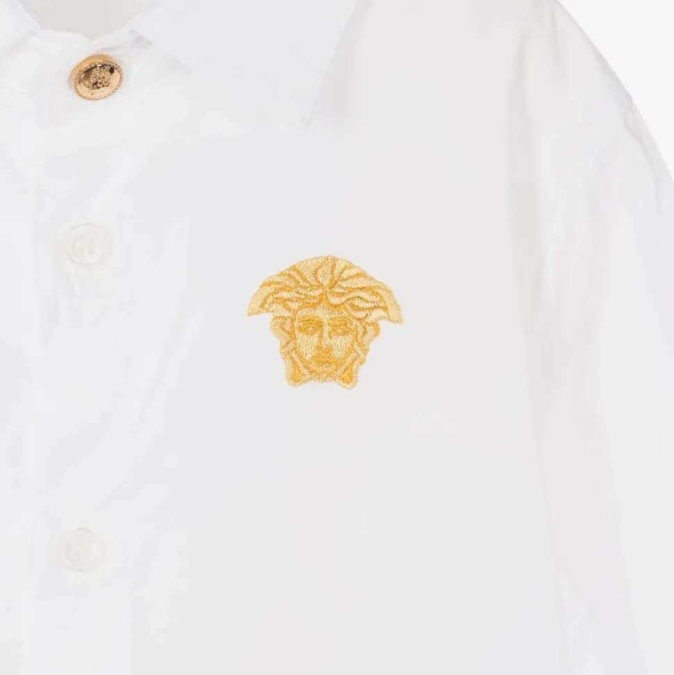 Smart white long-sleeved shirt for baby boys by luxury Italian designer Versace, made in soft cotton poplin. The signature Medusa logo is embroidered in gold on the chest. It buttons up neatly on the front, with shiny gold-tone Medusa accent buttons on the cuffs and below the pointed collar.