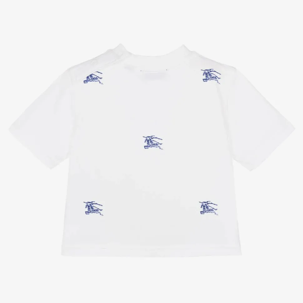 White organic cotton T-shirt for baby boys from British brand Burberry, made in soft jersey for a gentle feel against the skin. Adding a distinctive designer look, it is patterned with the label's scribble-effect Equestrian Knight Design in Knight blue, with a larger embroidered version above the hem. Popper fastenings on one shoulder allow for easy, over-the-head dressing.