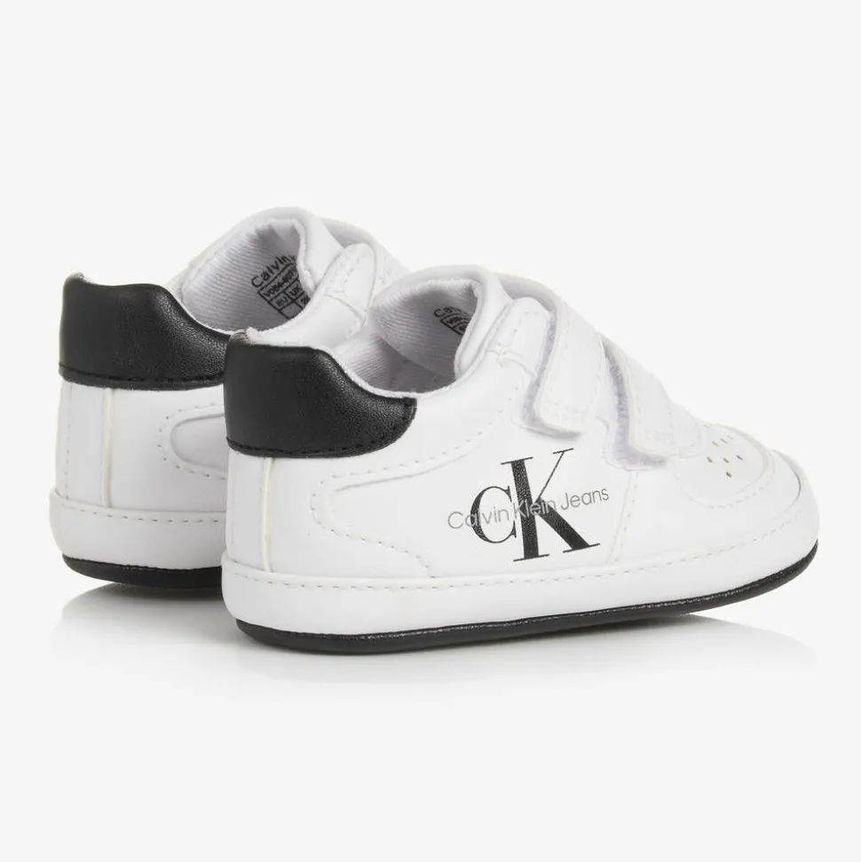 White faux leather pre-walker trainers for baby boys by Calvin Klein, with a black trim on the heel. They have the CK monogram logo printed on the side in black and grey for instant brand recognition. Sporty and casual, they are lined with soft cotton and fasten across the foot with velcro straps for a comfortable fit. Ideal for your little one's first steps, the contrasting black outer soles are soft and flexible. This item contains at least 50% recycled cotton.