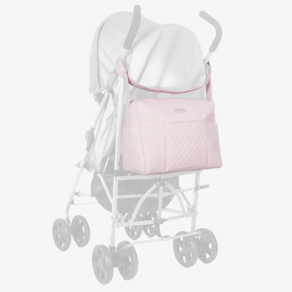 Pale pink changing bag by Babidu, made in softly padded faux leather. It has quilted pockets outside and fastens with a zip. Inside it has a lightweight cotton lining with elasticated straps and various pockets. The handle has poppers, which when fastened create loops for use on the stroller.