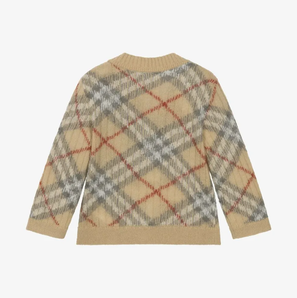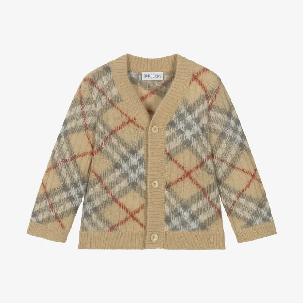 Lovely beige cardigan for baby girls by luxury brand Burberry. Knitted in a beautifully soft blend of alpaca wool, silk and mohair, it features the designer's signature Burberry Check. In a classic V-neck style, it fastens with buttons down the front.