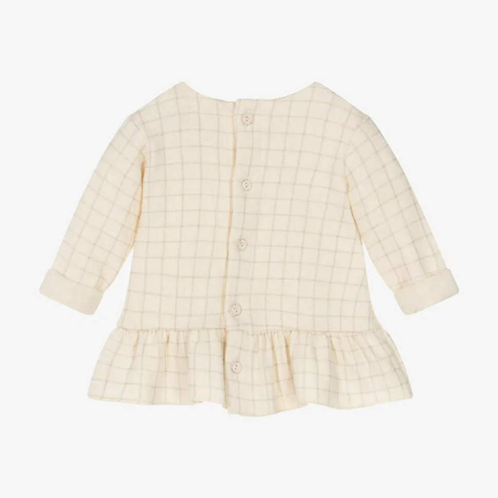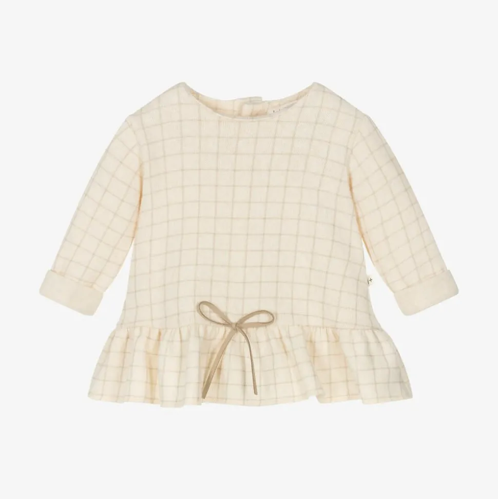 Sweet ivory cotton and viscose blend dress for baby girls by Spanish brand 1 + in the family, with a grey check pattern. Made in a super soft, brushed knit, it has a faux suede bow on the front in beige, cute, fixed turned-up cuffs on the long sleeves and a frilled hemline. It fastens on the back with buttons. 40% of the cotton yarn used in this fabric is recycled.