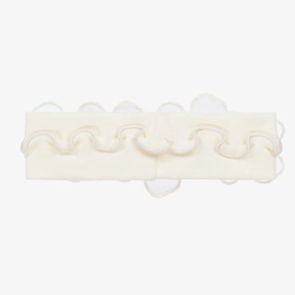 A lovely ivory headband for baby girls by Sofija. It is made in soft and stretchy cotton jersey, with pretty 3D pink organza flowers.