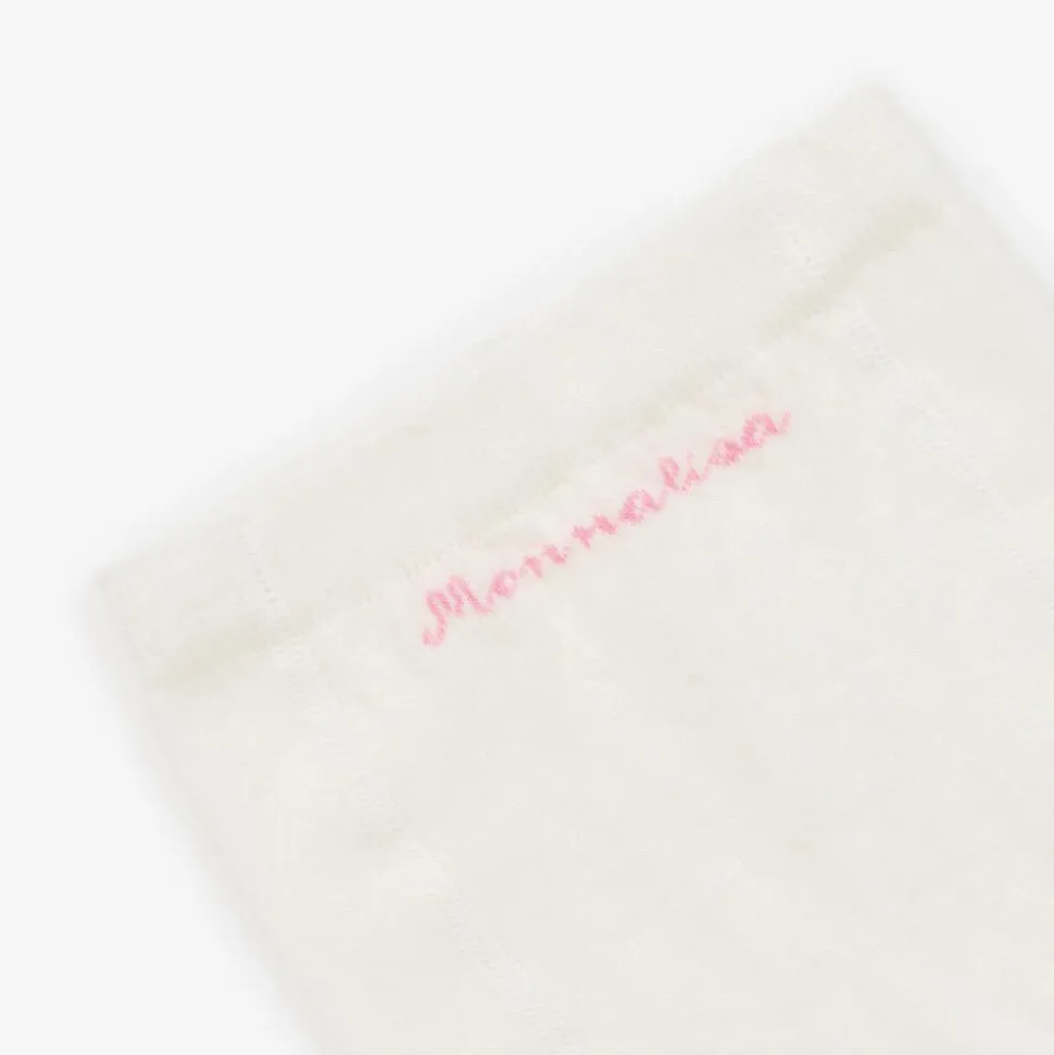 Sweet ivory tights for baby girls from Italian brand, Monnalisa. Made in a soft and stretchy cotton-rich knit, each leg has a teddy bear motif with a pink bow and heart. A pink logo design is added to the back for a branded touch.