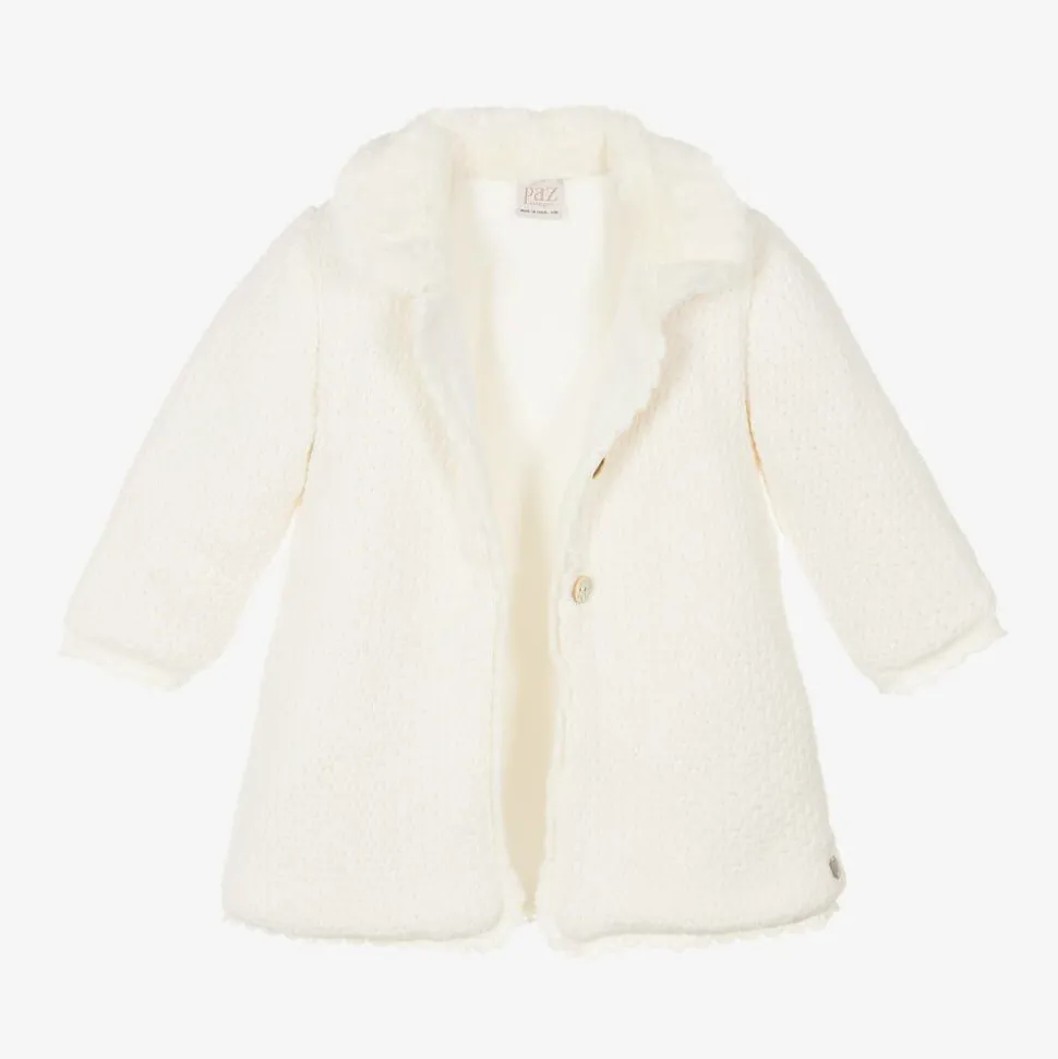 Ivory softly knitted coat for baby girls by Spanish label Paz Rodriguez. Traditionally styled, this cosy coat has a super soft faux fur collar and a pretty scalloped knit trim. Lined in soft velour for extra warmth, it fastens with mother-of-pearl branded buttons on the front. A delicate logo charm stitched just above the hem adds a sweet designer finish.
