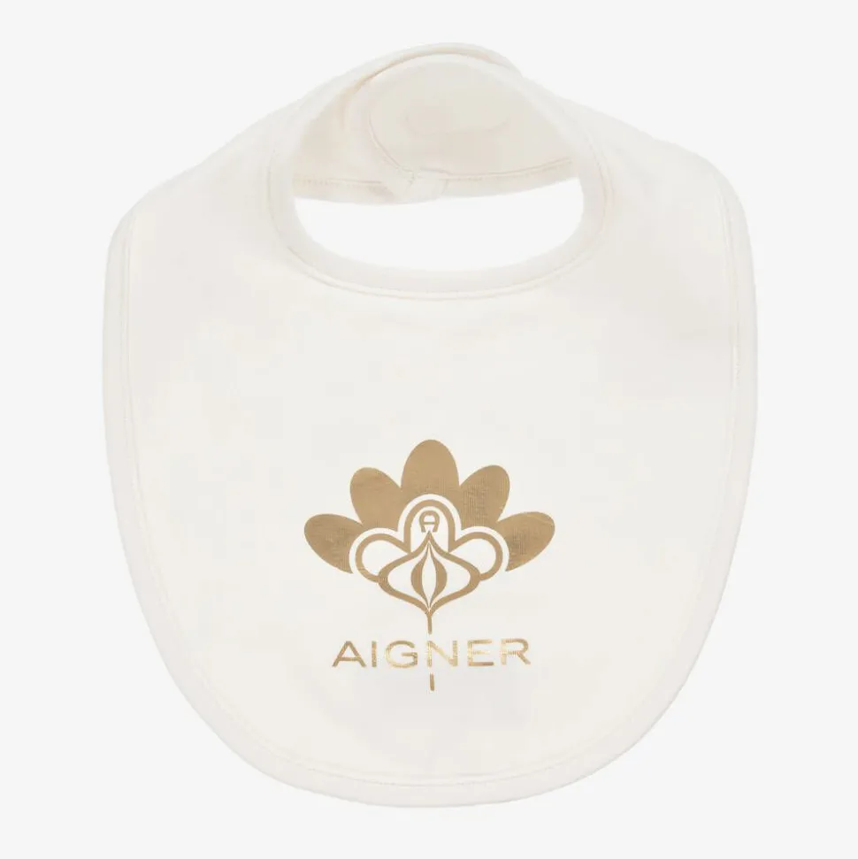 Ivory bib for baby girls by AIGNER, made in beautifully soft Pima cotton jersey. This useful feeding accessory has a pretty, metallic gold floral logo design printed on the front and an easy-to-use velcro fastening on the back of the neck.