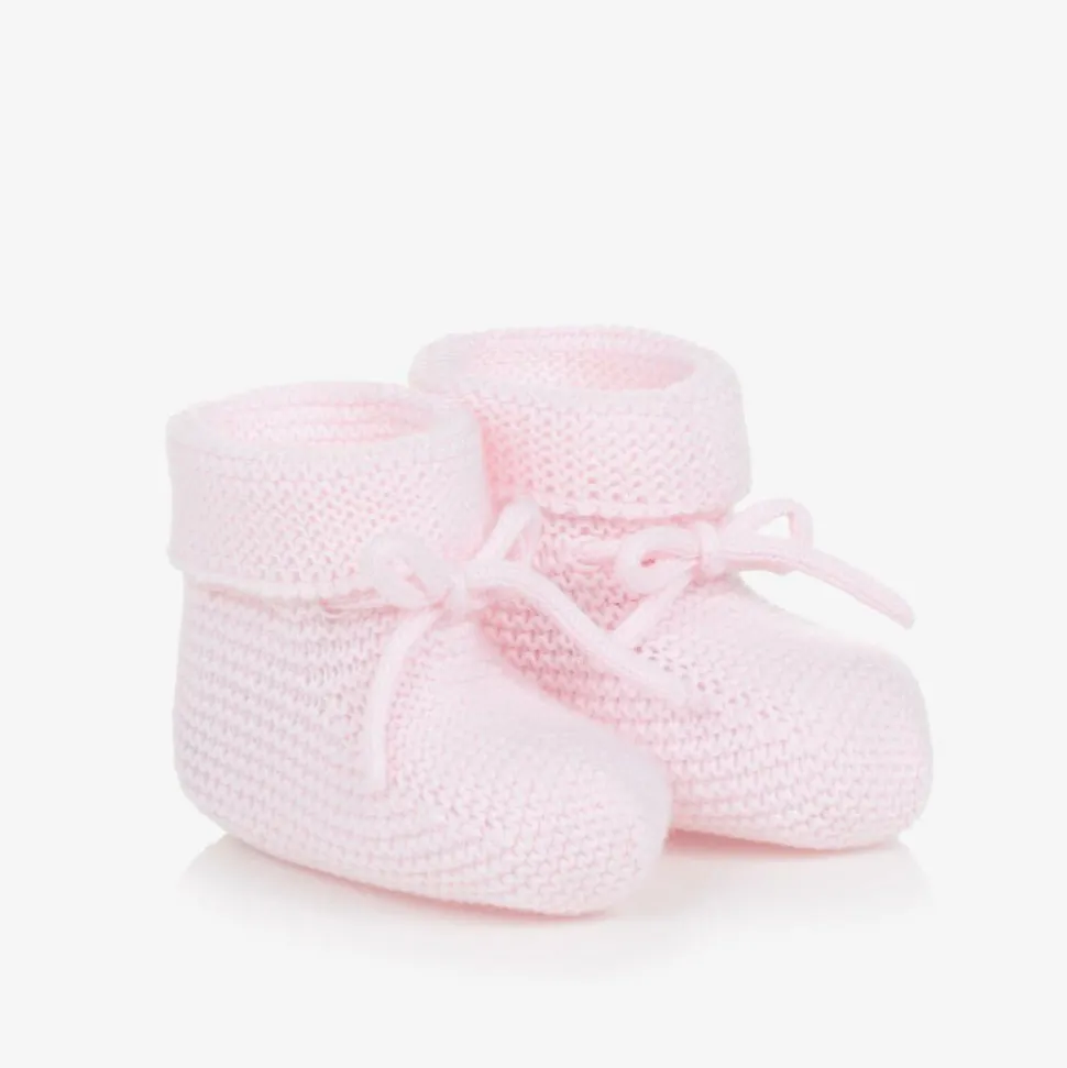 Pale pink booties for baby girls by classic Spanish designer Paz Rodriguez. Knitted in beautifully soft cotton, they have fold-over cuffs and a tie fastening on the front for a secure fit and sweet finish.