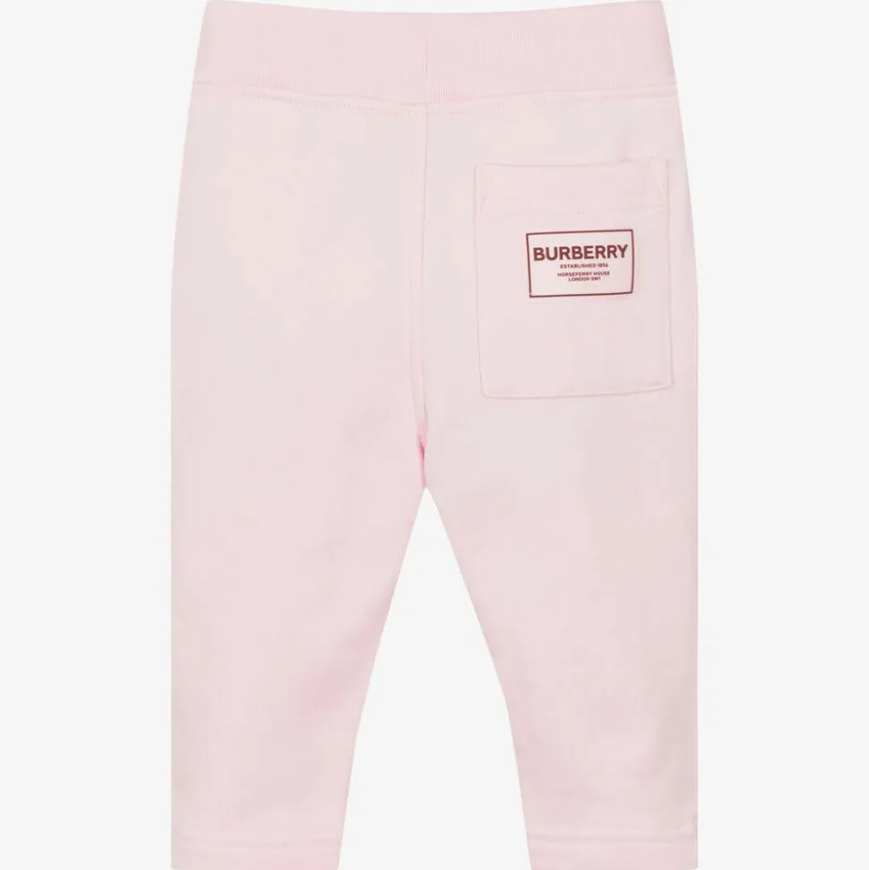 Candy pink joggers for baby girls by Burberry. Soft and stretchy, they are made in mid-weight cotton sweatshirt jersey and feature and embroidered Thomas Bear logo on one leg. They have a wide, ribbed waistband for comfort and fit, with pockets at the sides.