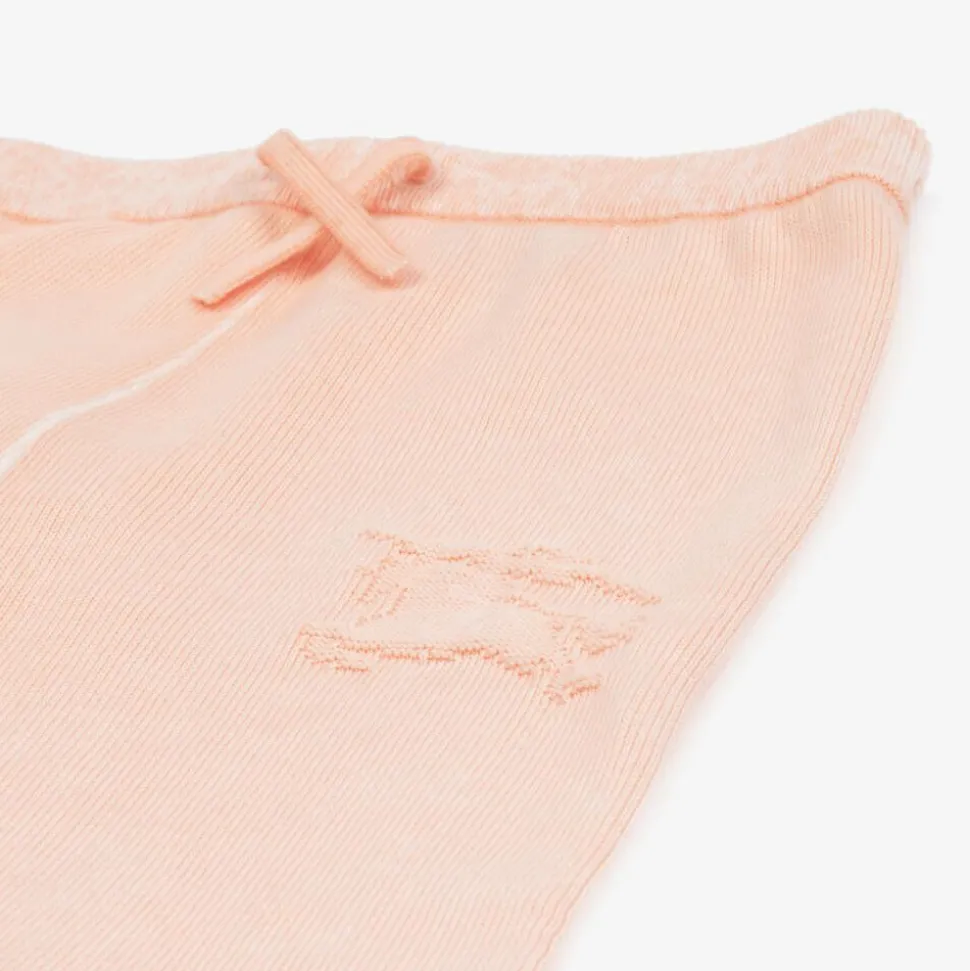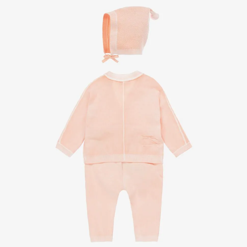 In a lovely shade of pale coral pink, this trouser set for baby girls by luxury British brand Burberry is presented in a delightful gift box. Comfortable to wear, the set is made from a soft cotton knit with a washed look and ribbed trims. The long-sleeved V-neck cardigan fastens with pearlescent branded buttons and the adorable bonnet has a sweet pom-pom detail and ties neatly under the chin. The joggers have a tonal jacquard Equestrian Knight Design for a signature look and an elasticated waist for a comfortable fit.