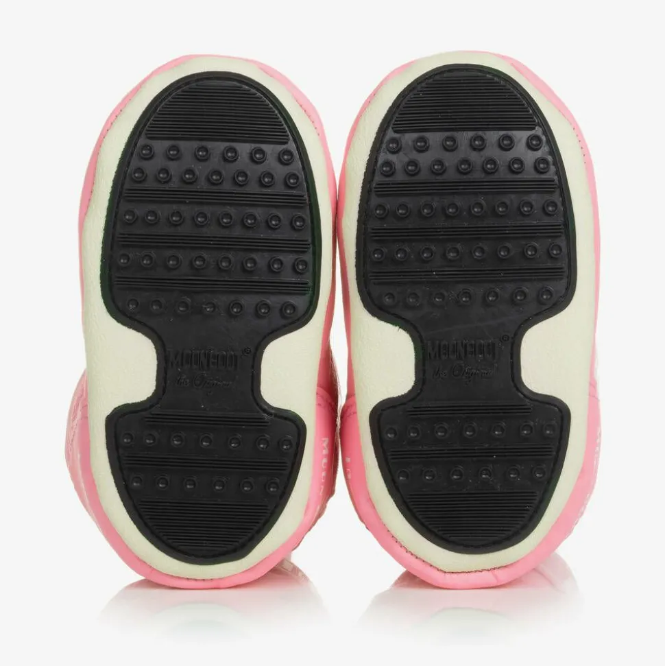 Pink water-repellent snow boots for baby girls by Moon Boot. In the brand's original iconic style, they are padded and lined with soft faux shearling for extra cosiness. They have an elasticated logo band around the ankle to support the shoe and elasticated front laces to easily slip them onto little feet. The durable outer sole is designed with tiny suction pads for improved grip.