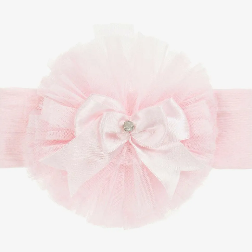 A soft and stretchy, pink headband for baby girls by Beau KiD. It has a large tulle and ribbon bow detail, with a sparkly diamanté in the centre.