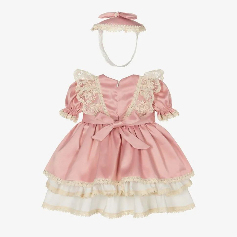 Traditionally styled, this pink dress set for baby girls is by Andreeatex. Made from silky satin, it has two layers of white lightweight cotton lining that is visible below the hemline for a voluminous silhouette. Trimmed with ivory lace, it has ivory floral-embroidered tulle frills over the shoulders and pretty faux pearl detailing for added charm. It has puffed short sleeves with elasticated cuffs and is decorated with an appliqué bow and tonal cameo embellishment on the front. There is a concealed zip fastening and silky sash ties that secure into a pretty bow on the back. The coordinating lace headband has a padded fascinator to complete the heritage look.