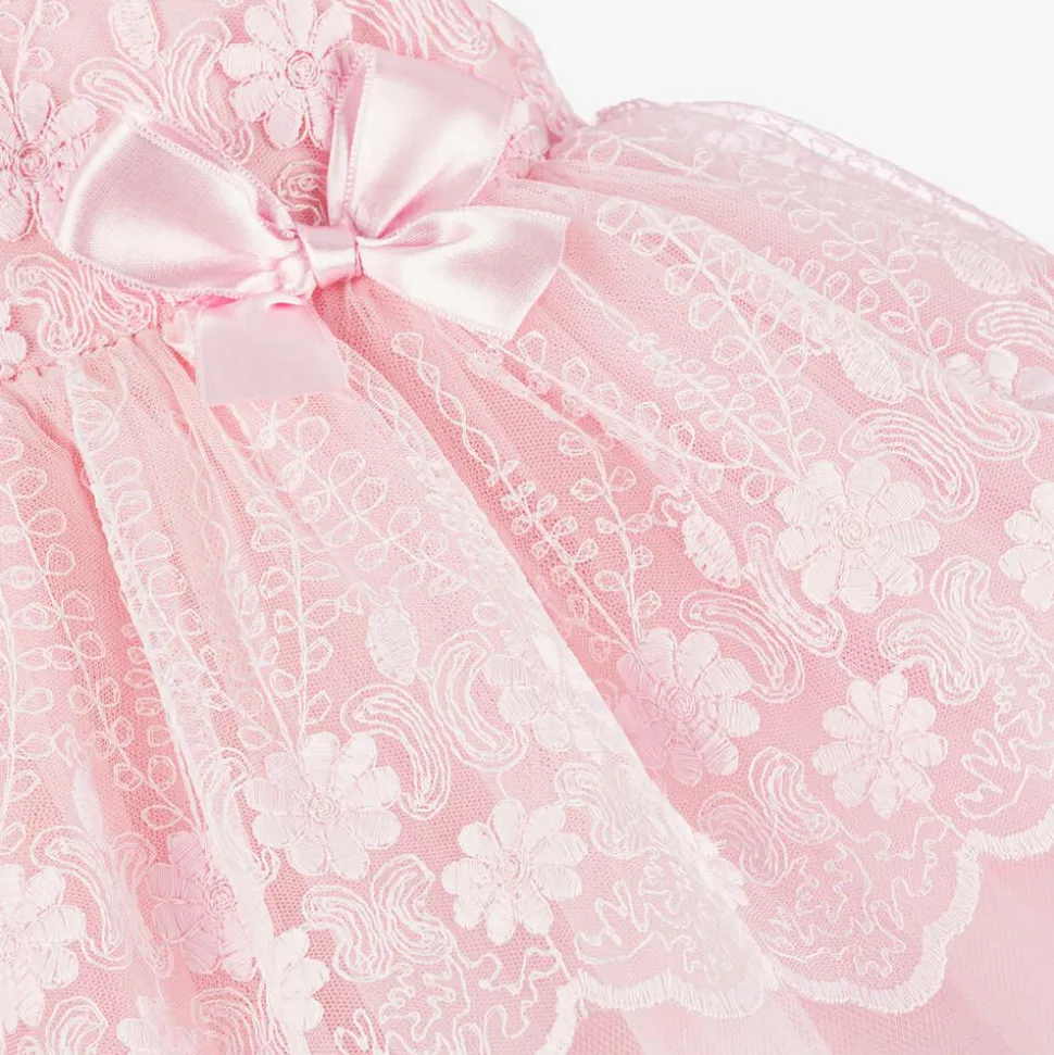 A beautiful pink special occasion dress for baby girls by Beau KiD. Made from layers of lightweight tulle, it has a floral-embroidered tulle overlayer with scalloped edging for a sweet and delicate look. It has a silky underlayer and a smooth woven cotton-blended lining for extra comfort. Fastening with poppers, there is an appliqué satin ribbon bow on the front, frilled short sleeves, and a detachable bow brooch that can be secured with a safety pin on the back for a delightful finish. A coordinating ivory and pink headband completes this elegant style.