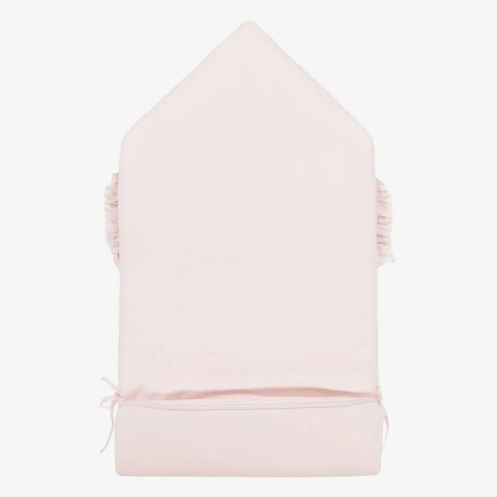 Exclusive to Childrensalon, this lovely pale pink nest for baby girls is by Pureté Du… Bébé. Cosy and warm, it is made in super soft velour with a cotton jersey lining and lightweight padding. It has a plumeti panel on the front patterned with a cute floral toy design and detailed with decorative bows and ruffle trim. The brand's logo is embroidered below in beige thread. There are buttons on the hood and a zip fastening along one side and across the base, with ties at the bottom to adjust the length. When unfastened it creates a comfortable, flat surface to lay baby on.