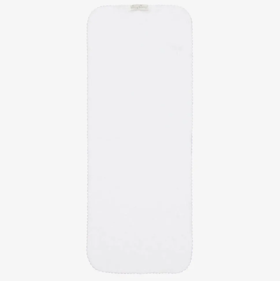 A pretty burp cloth for baby girls by Kissy Kissy, made in super soft Pima cotton jersey. It is patterned in lilac purple flowers on a white background, with picot embroidery trim. Lined in absorbent cotton towelling, it is useful for placing over the shoulder when burping baby after a feed.