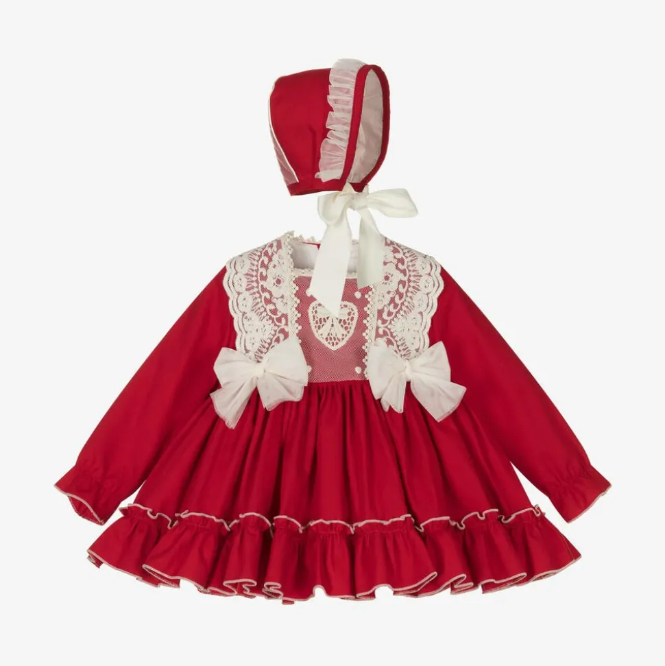 A charming red cotton dress set for baby girls by Abuela Tata, trimmed with delicate ivory lace for a classic look. Made in soft twill, the long-sleeved dress has gently elasticated cuffs, a frilled hemline and a soft cotton blend lining. Gathers on the waist create a delightfully full skirt, with pretty tulle bows detailing the front and a matching tulle sash and pearlescent button fastenings on the back. Completing the traditional look, the dress comes with matching knickers and a sweet bonnet that secures beneath the chin with satin ribbons.