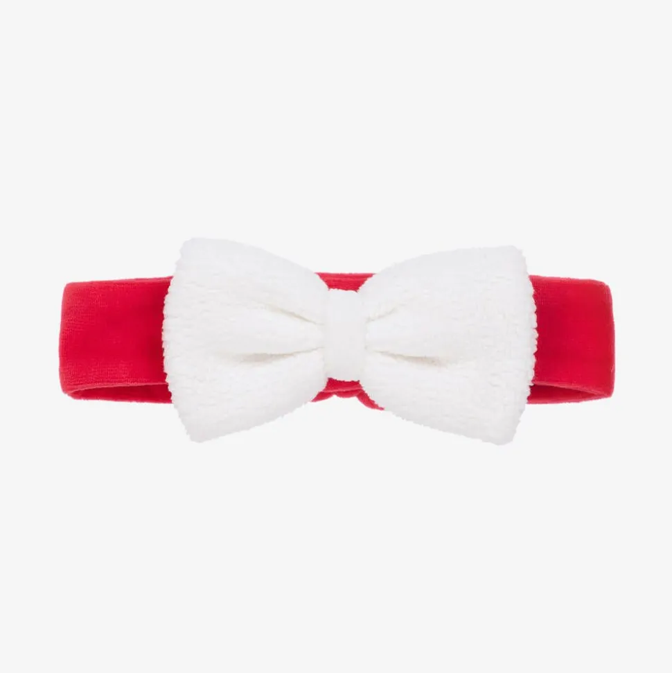 Pretty red hairband for baby girls by Kissy Kissy, made in soft velour. It has a large white bow on the front and an elasticated back for a comfortable fit.