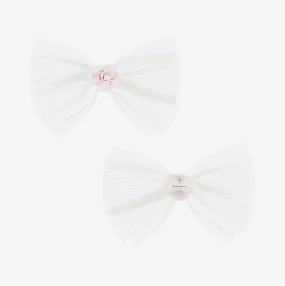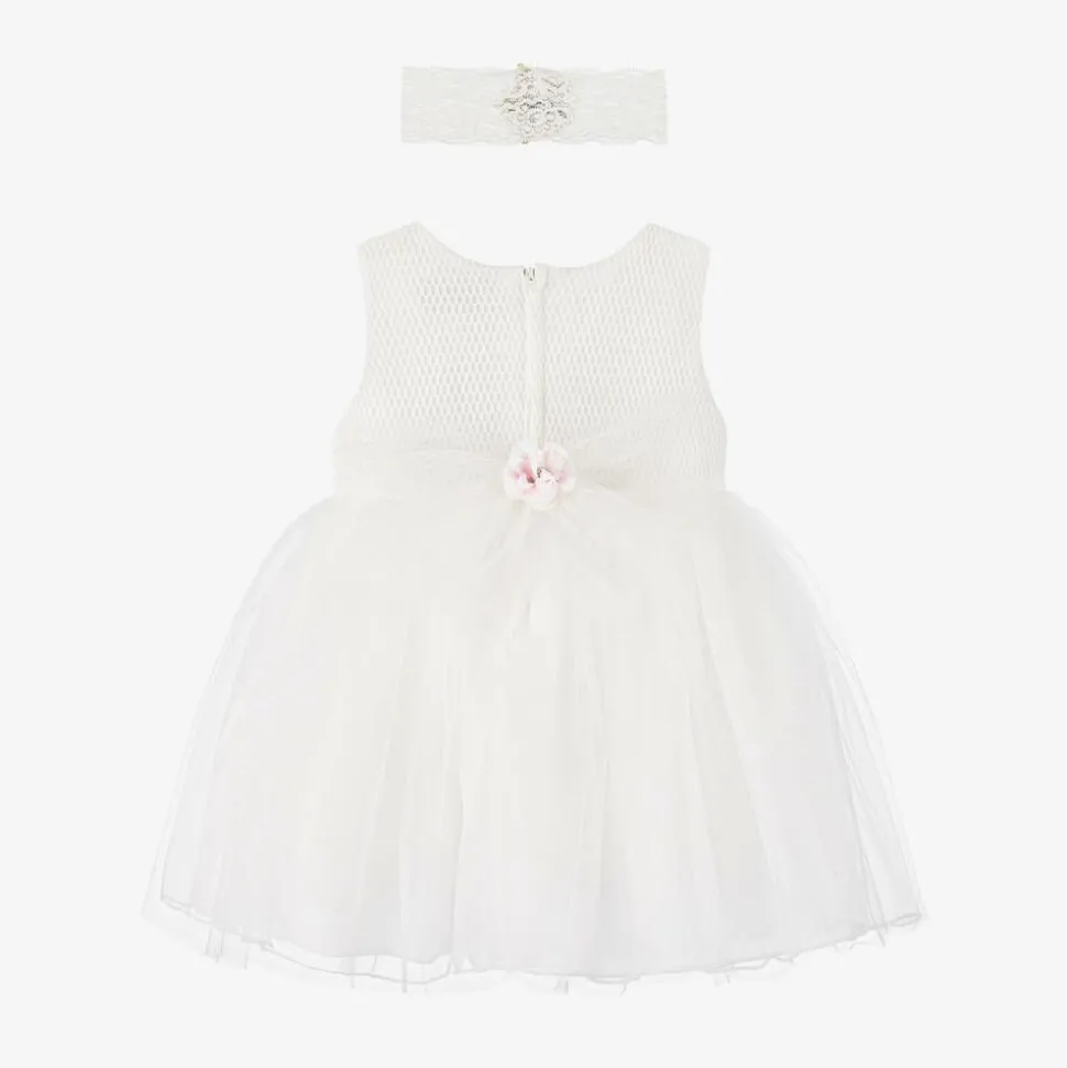Baby girls white dress and headband set from Beau KiD. The bodice is made in pretty soft mesh with pearl trim on the neck. The skirt has gathered layers of voluminous tulle and is decorated with fabric flowers, leaves and diamantés. There is a removable flower and tulle brooch on the back and a matching stretchy lace headband.