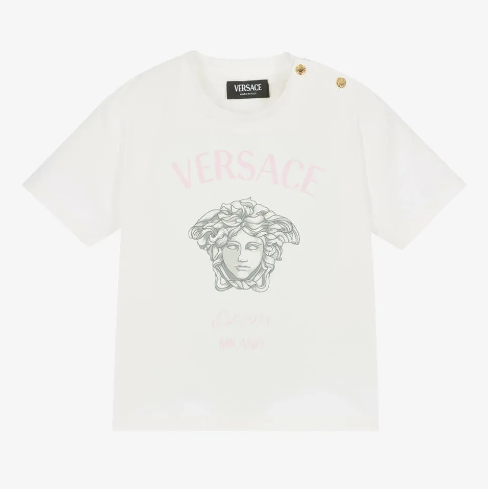 Off-white short-sleeved T-shirt for baby girls by Italian luxury brand Versace. Instantly recognisable, it has the iconic Medusa logo printed on the front, with the designer's name in pink. Made in soft cotton jersey, this casual tee has a crew neckline and gold-tone poppers on one shoulder to assist with dressing.