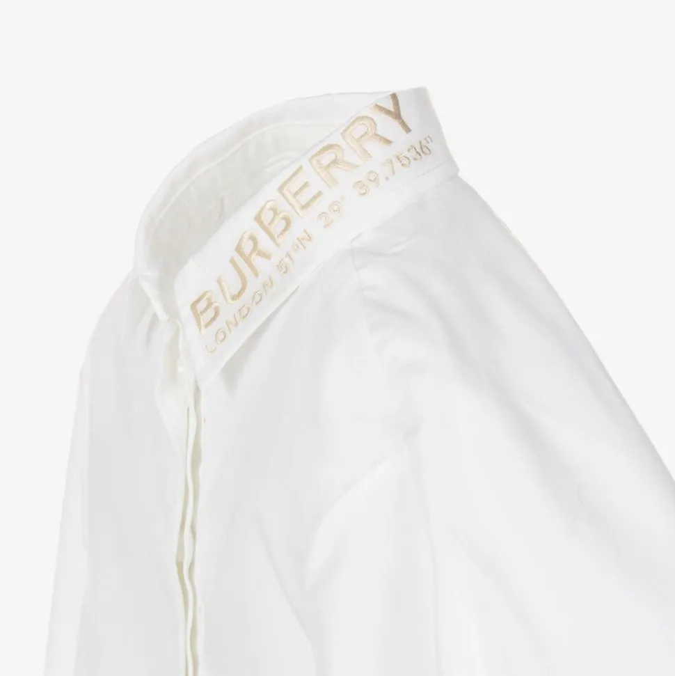 A white shirt dress for baby girls by luxury British brand Burberry, made from soft cotton poplin with a hint of stretch. Fastening with concealed buttons on the front, this lightweight design has a cape-style back that runs across the back of the shoulders and sleeves. Burberry HQ coordinates are embroidered on the collar in metallic beige for instant designer appeal. Gathered at the waist, it is lined with breathable cotton voile and finished with elasticated cuffs for ease of wear.