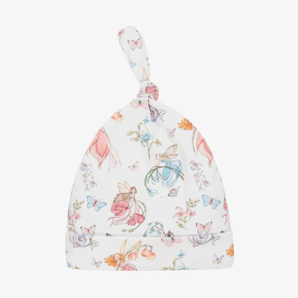 Patterned in a delightful flower fairy print in blue and pink, this white hat for baby girls is by My Little Pie. Made in super soft organic Supima cotton jersey, it has a turned up brim and a sweet little top knot.
