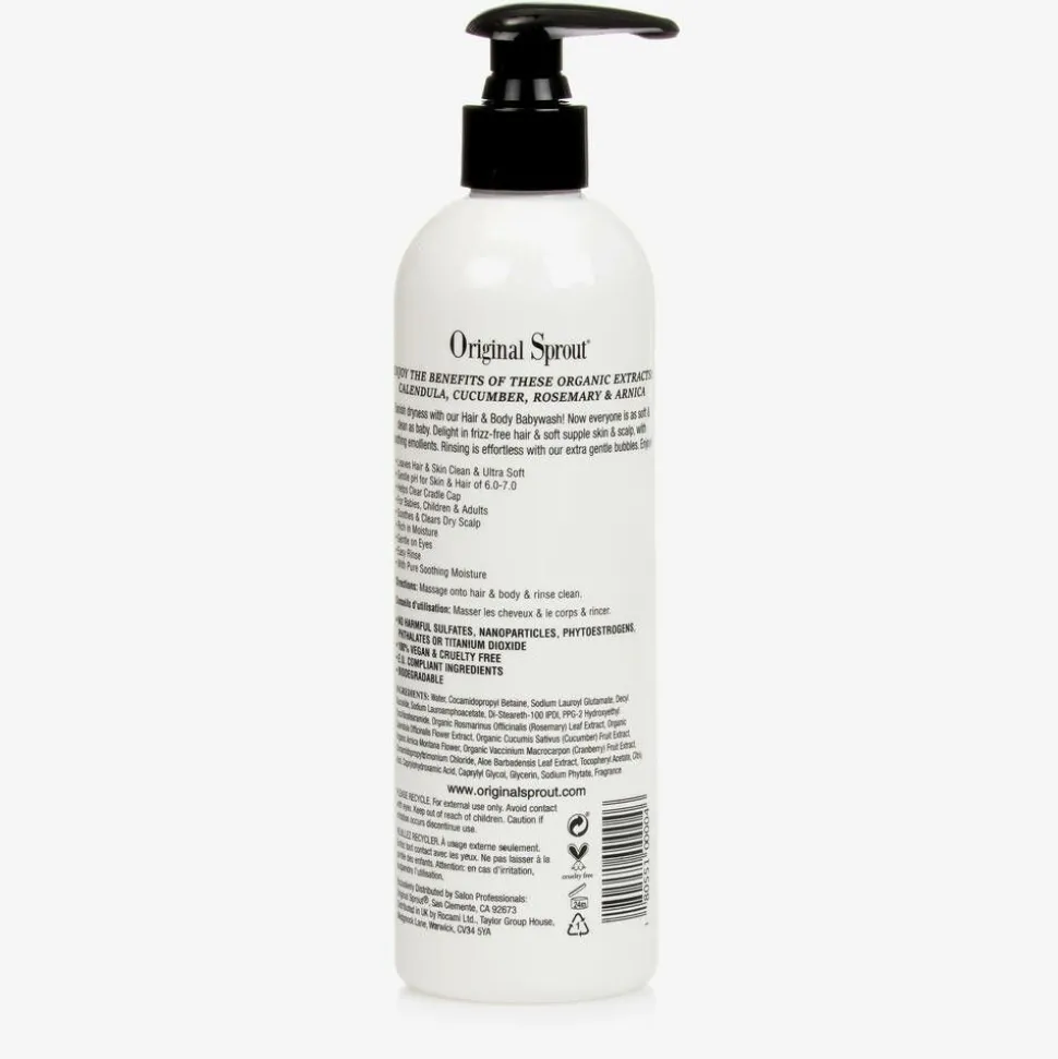 Moisturising 2-in-1 Hair and Body Babywash by Original Sprout, suitable from birth. Gentle on the eyes, it soothes and clears dry scalp and is suitable for sensitive skin. Apply to hair and body, rinse clean and achieve frizz-free hair and soft, supple skin.