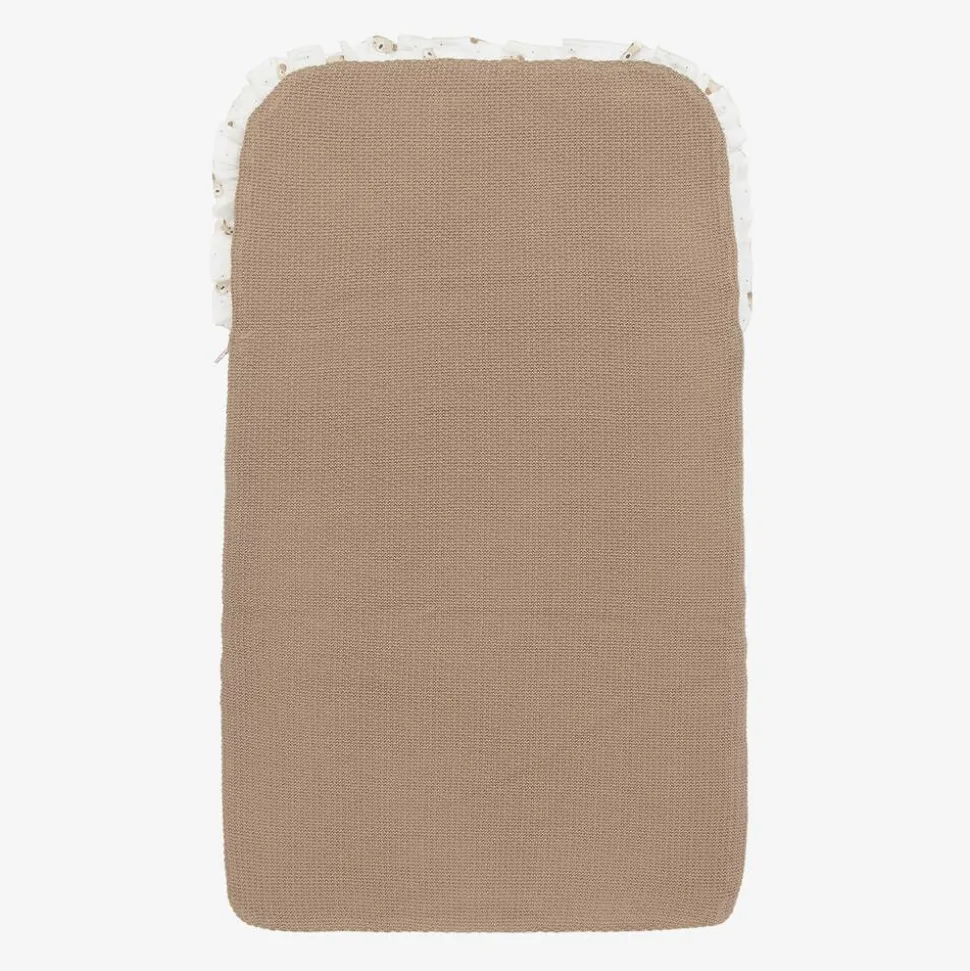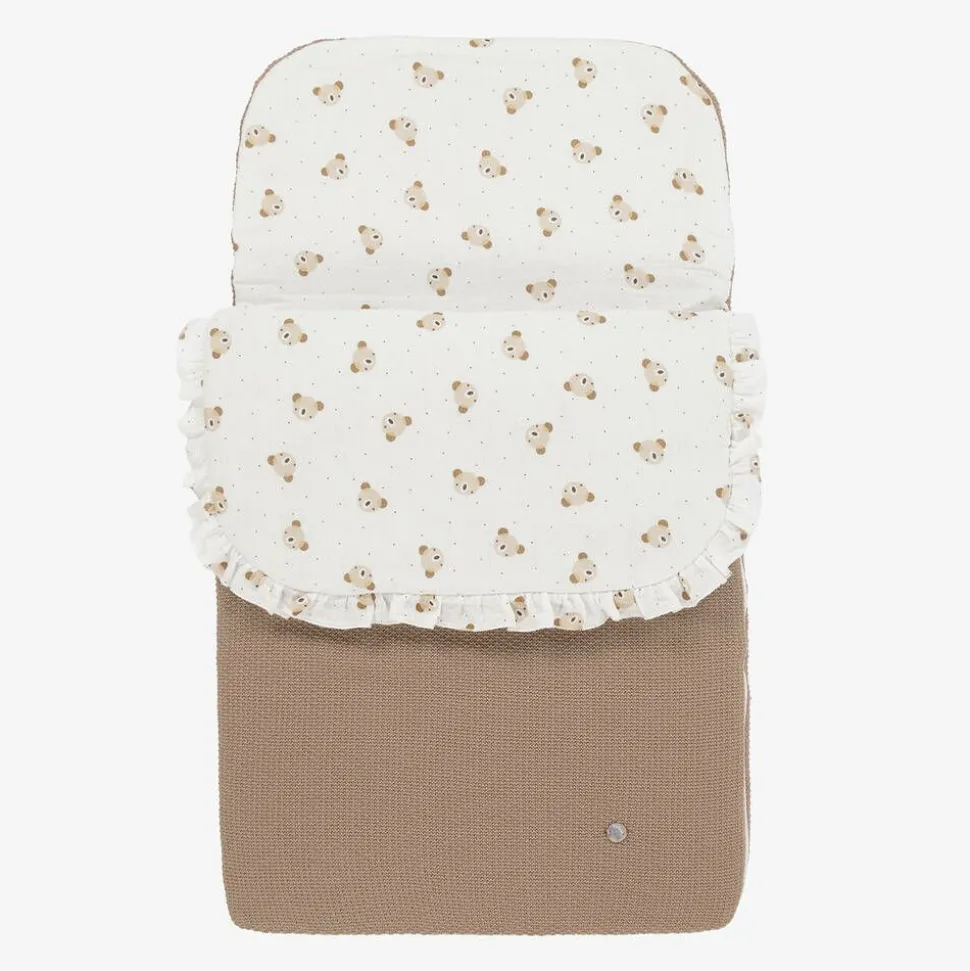 A lovely dark beige baby nest for boys and girls by ArtesanĂa Granlei, in a soft and mid-weight knit with a ruffled trim. Comforting for baby, this padded nest has a fold-down front with a cute bear and dainty polka dot print. Lined with gentle cotton muslin, it has a mother-of-pearl logo charm on the front for a signature touch. The zip fastening goes all the way around which allows the nest to be opened fully and laid flat.