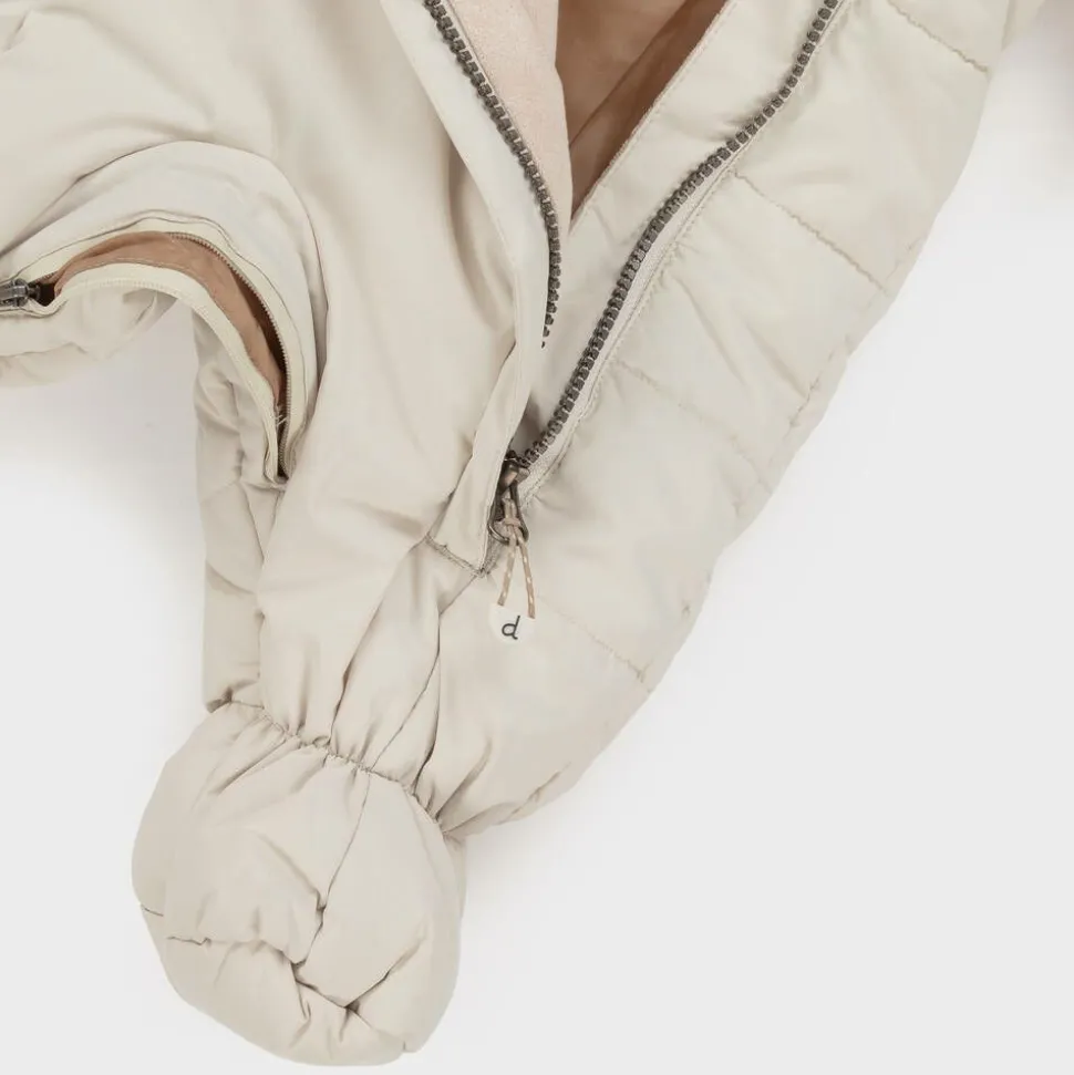 Both cute and practical, this beige snowsuit for baby boys and girls is by Deux par Deux, with an embroidered bear face and faux fur 3D ears on the front. Warm, with lightweight padding, it is water and soil repellent, as well as quick drying and breathable. It has fold-over, fleece-lined mitts and integral booties for extra cosiness. The front panel has zips on the sides and below, so that car seat straps can go behind and be used with ease with less thickness. The faux fur hood trim is secured with poppers and the waistband is adjustable for a good fit. It is lined in velour and satin for comfort. it comes with a snuggly fleece neck warmer lined in velour and secured with velcro.