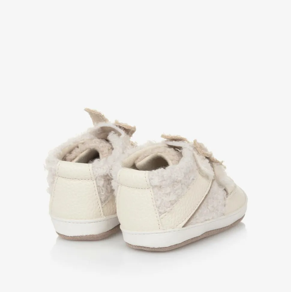 Adorable, beige pre-walker trainers for baby boys and girls by Mayoral, in soft and fluffy borg fleece with ivory faux leather trim. Lined in soft cotton jersey, they have comfortable flexible soles with rubberised print and branding detail. Two velcro straps allow for an adjustable fit and are topped with bunny face appliqués for a cute finish.