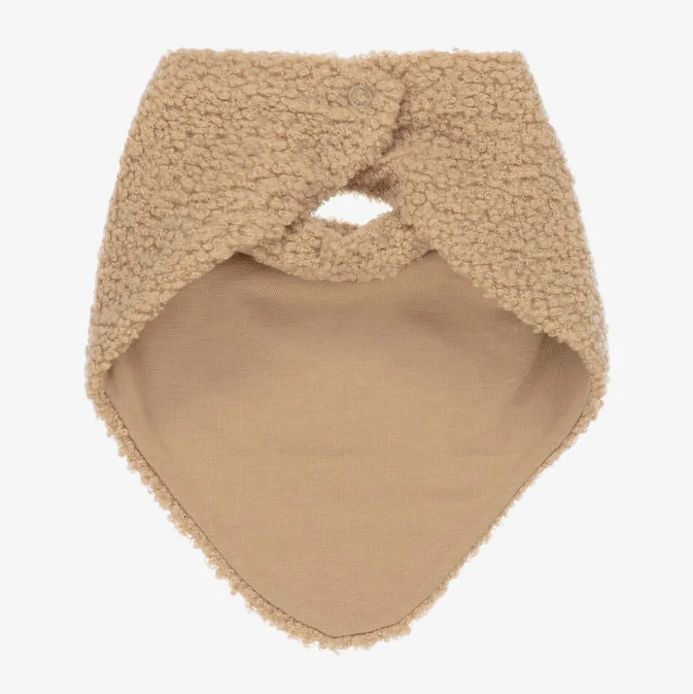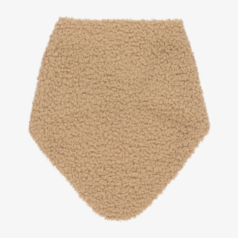 Cosy and comfortable for baby boys and girls, a beige bouclé scarf by Polish brand Jamiks. This bandana-style neck warmer has a soft cotton jersey lining and fastens easily with a single popper behind the neck.