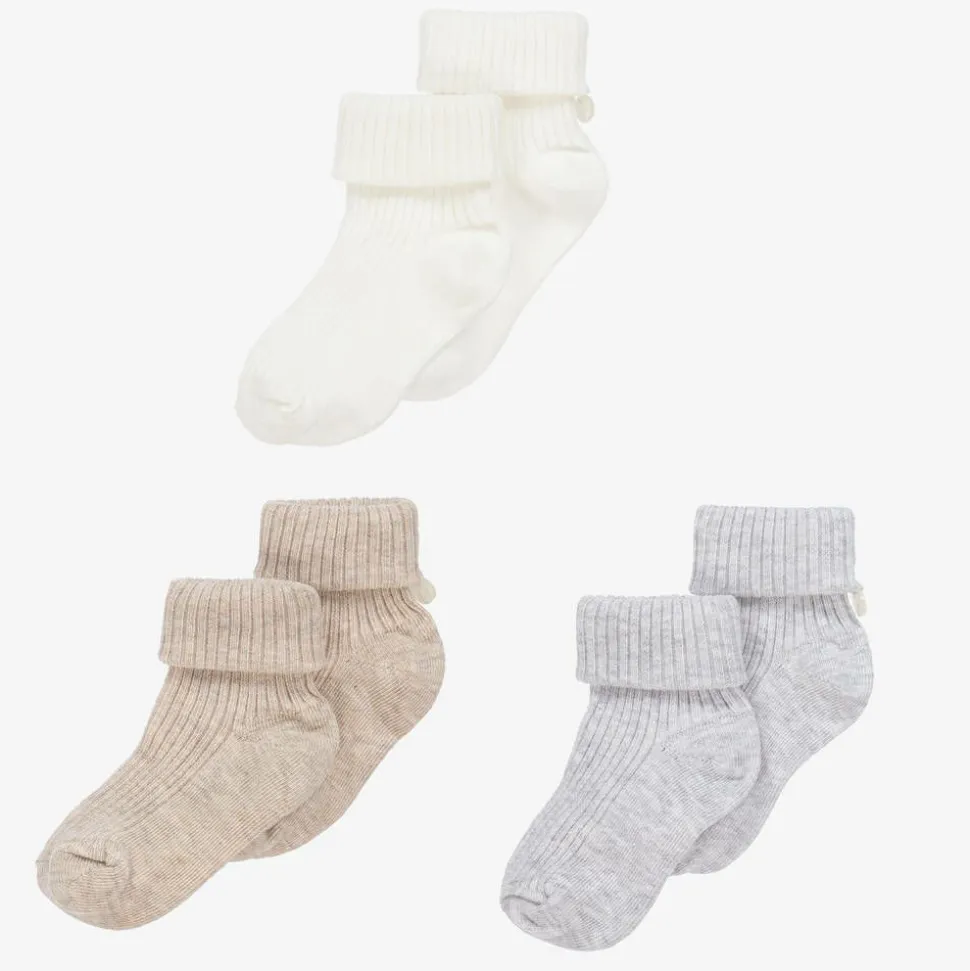 Three pairs of beige and grey ankle socks for baby boys and girls by Tartine et Chocolat, knitted in a soft, mid-weight cotton mix. With fold-over cuffs to help keep them secure, each pair are detailed with a subtle logo charm on the back. Lovely as a gift for a new arrival, they are presented in a sweet box.