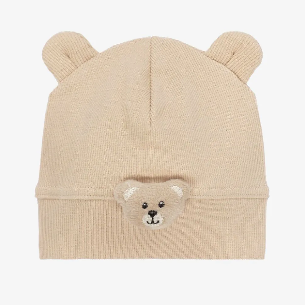 A beige hat for baby boys and girls from Jamiks, made in soft, stretchy, ribbed cotton. This adorable design has little ears on the top and a fluffy teddy bear appliqué on the brim.