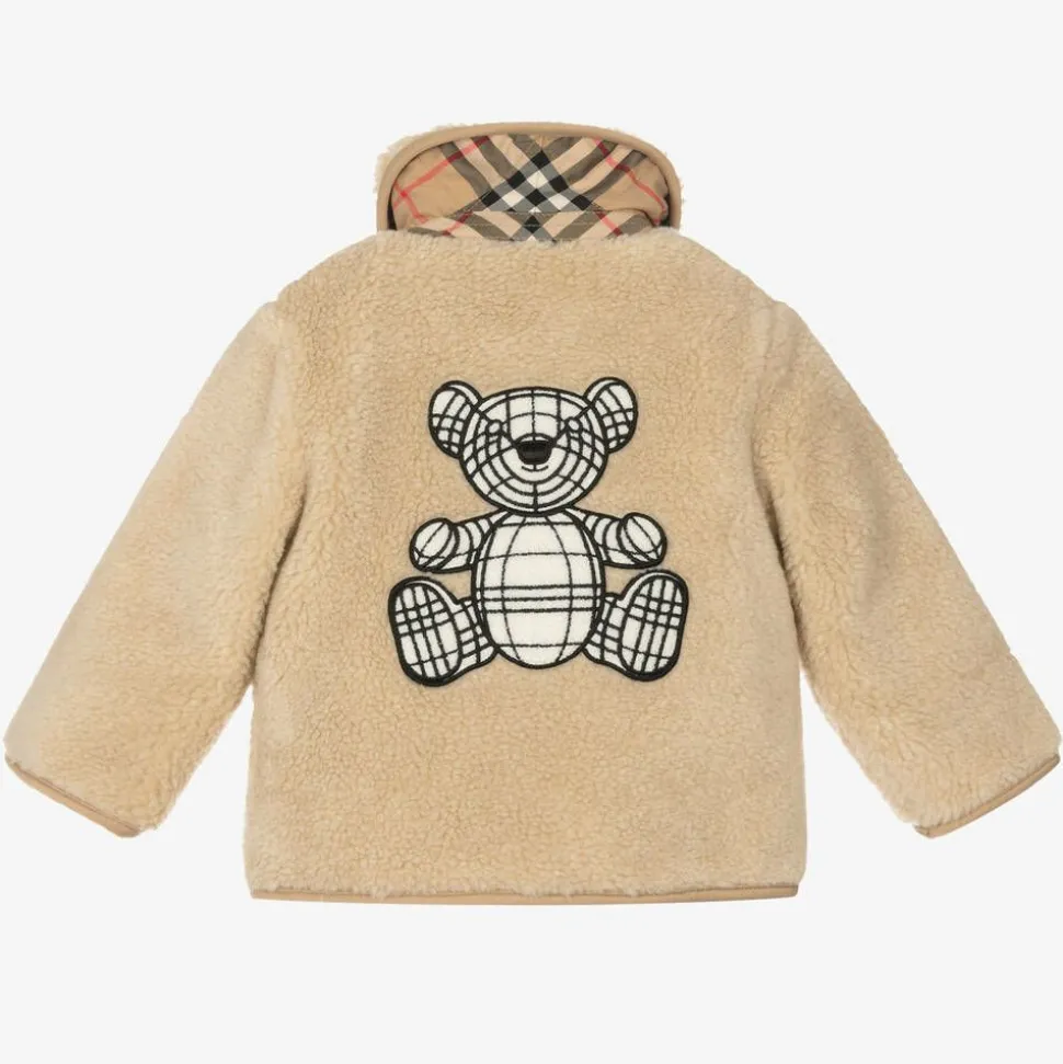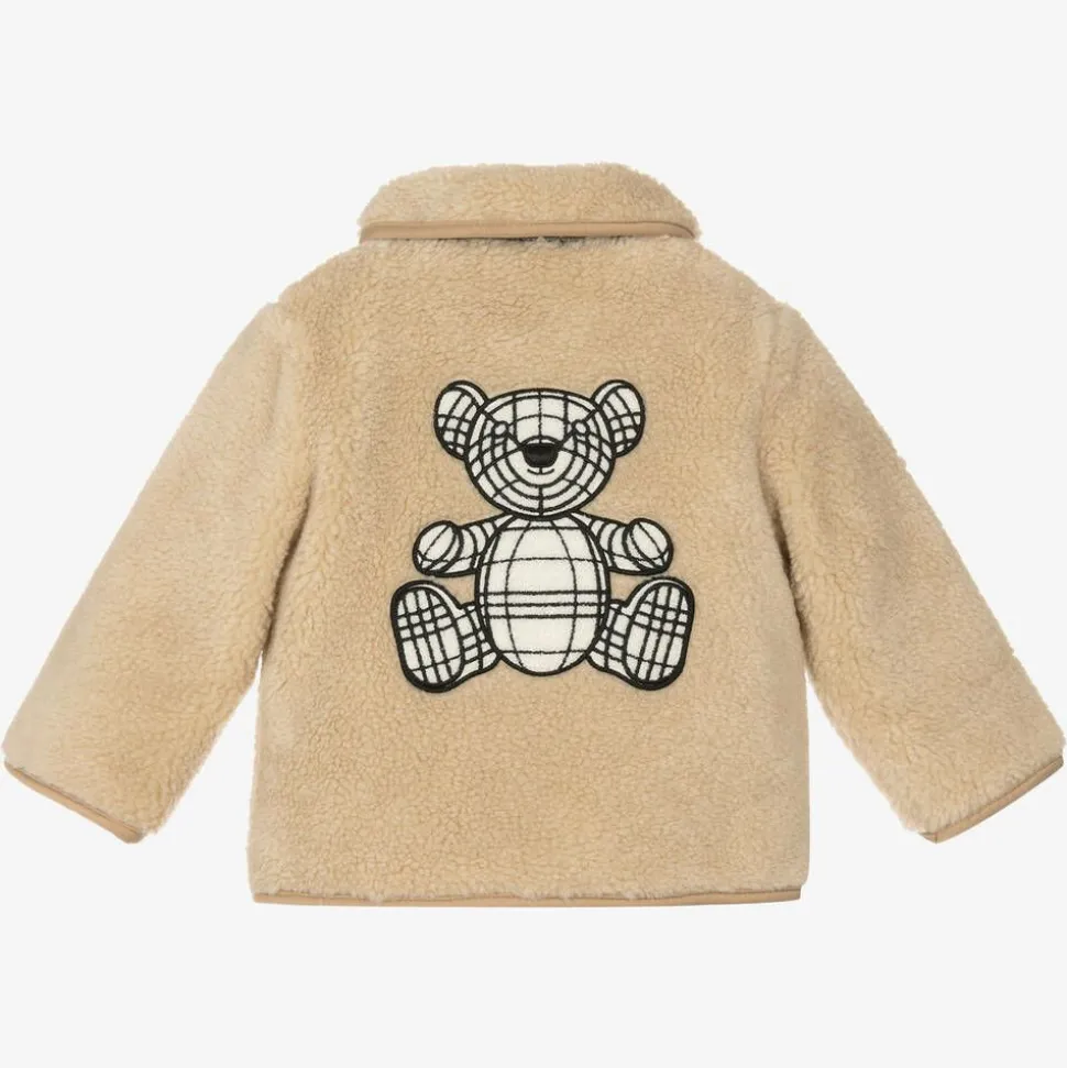 Adorable jacket for baby boys and girls by luxury British label Burberry, made in soft and warm sherpa fleece. This cosy design features a soft cotton jersey lining and trim, front patch pockets and toggle button fastenings. To complete the designer look, it has the brand's Vintage beige check trim under the collar and a gorgeous Thomas Bear appliqué on the back in white bouclé with black embroidery detail.