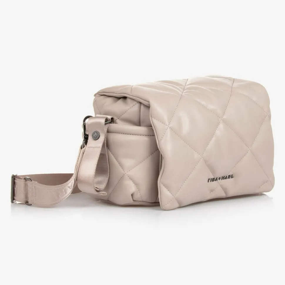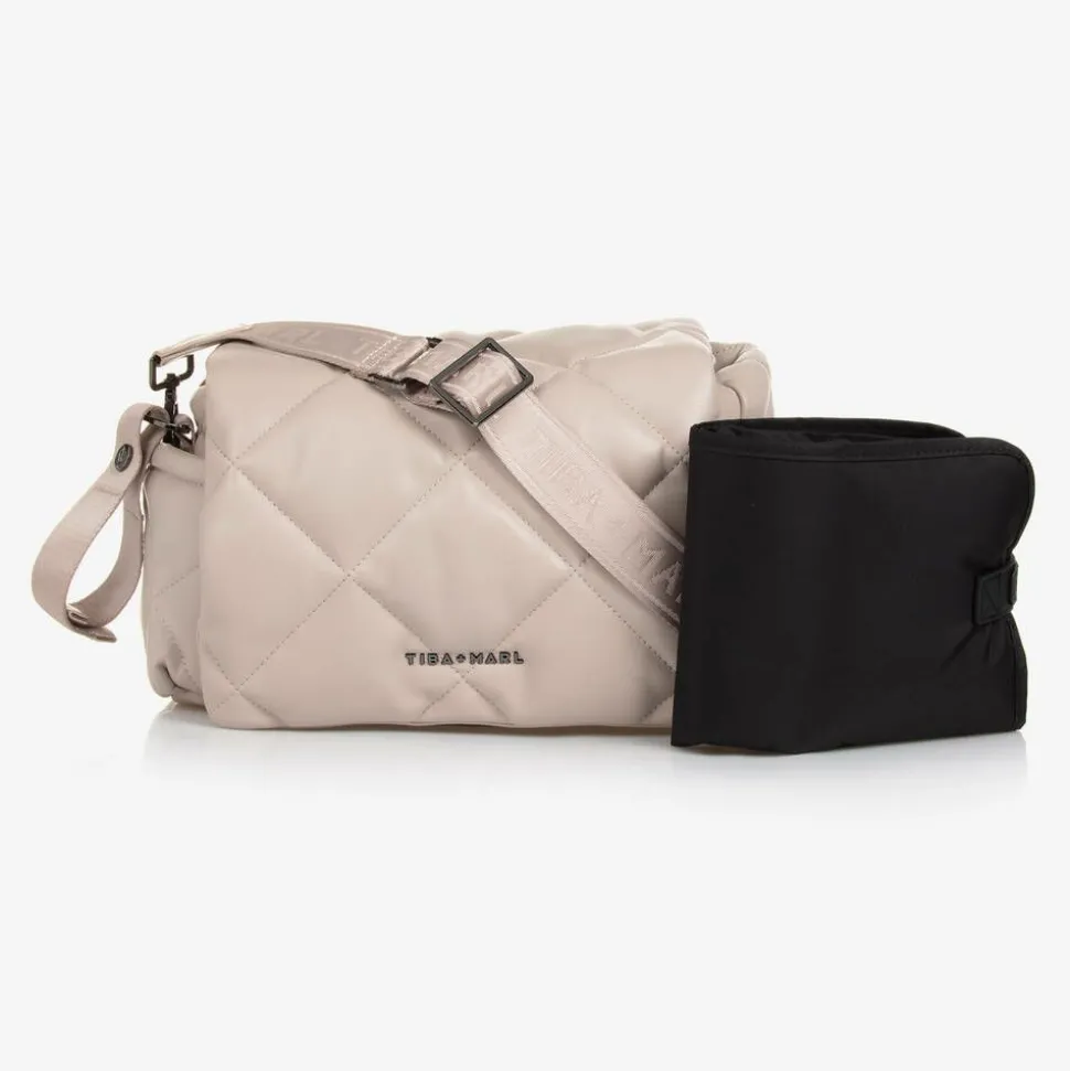 Beige changing bag by TIBA & MARL, made in soft quilted faux leather. The main compartment has an internal pocket and an insulated bottle holder. It fastens with a popper on an internal strap and a popper on the flap. There are multiple external pockets, attached stroller straps and a detachable, adjustable shoulder or cross-body strap. This compact bag has a dark grey metal logo on the front and comes with a padded changing mat.