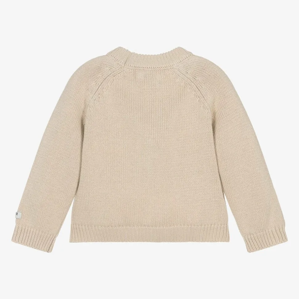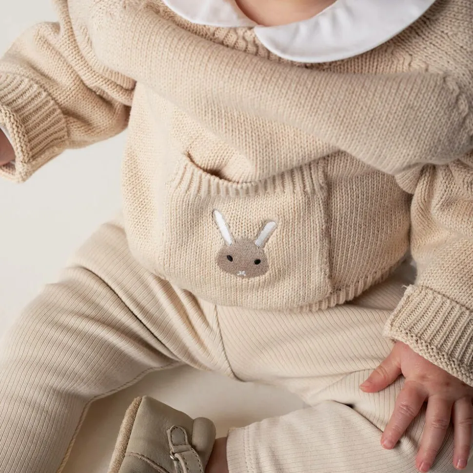 Amsterdam-based brand Donsje designs this beige handmade sweater for younger boys and girls. Soft and gentle on the skin, it is knitted in pure cotton. The front pocket feature is embroidered with an adorable bunny rabbit motif and the designer's logo label is stitched on the sleeve.