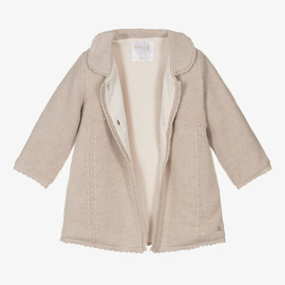 Traditional beige knitted pram coat set for baby boys and girls by Spanish brand Mayoral. Made in a soft, comfortable cotton blend, it has large, easy-to-use, button fastenings on the front and a cosy velour lining. A coordinating, knit-lined hat with an ivory, faux fur bobble on top completes the set.