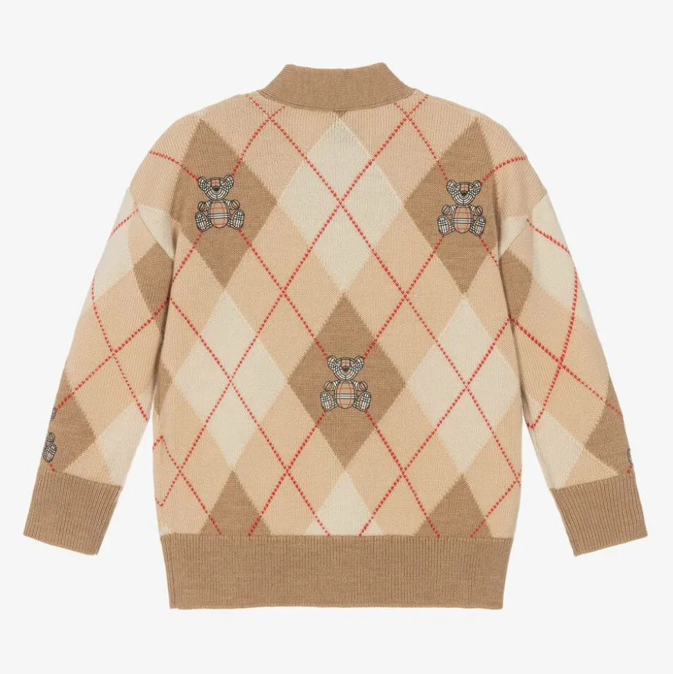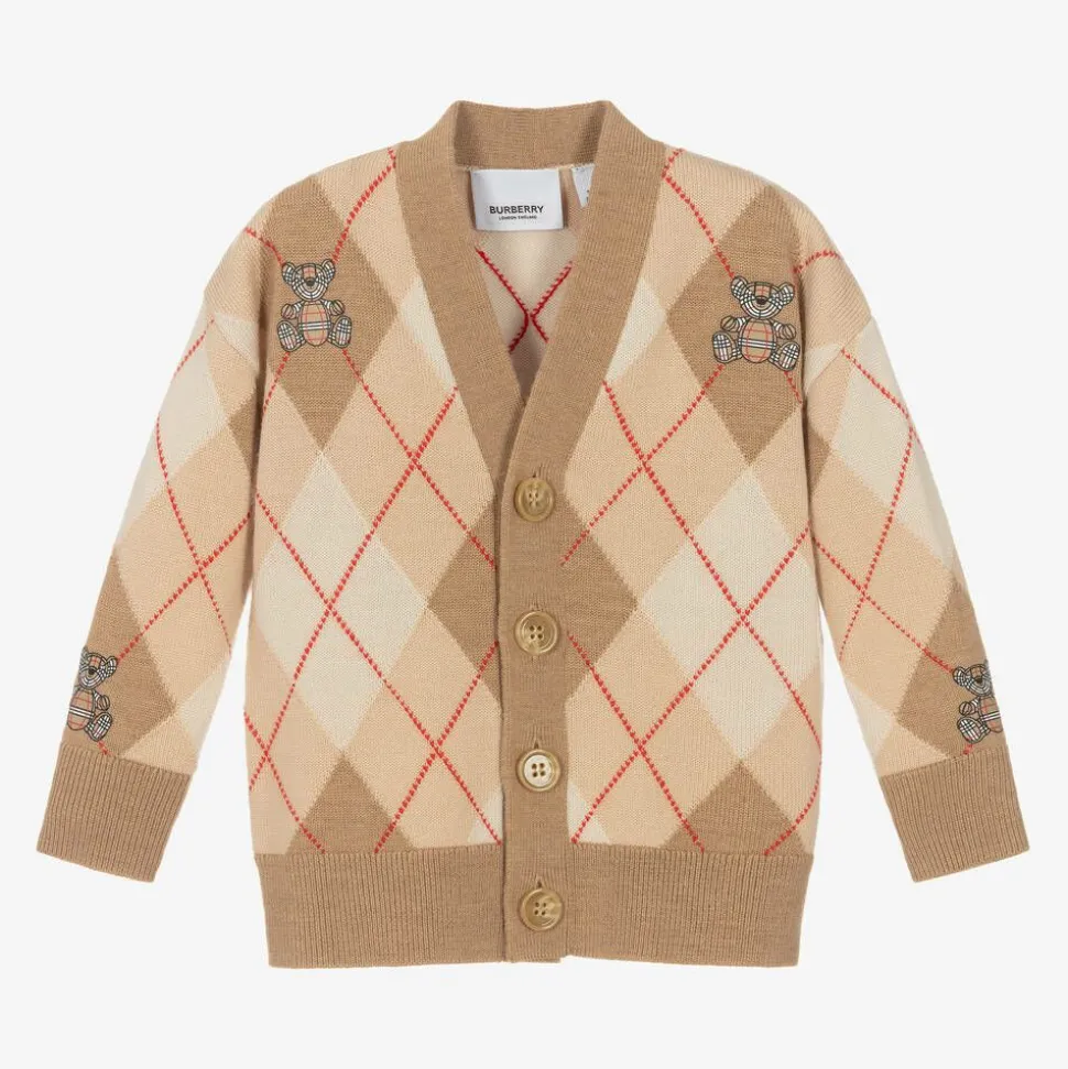 A beige cardigan for baby boys and girls by luxury fashion house Burberry, knitted in beautifully soft Merino wool. This cosy cardigan is designed with a lovely argyle pattern, featuring sweet Thomas Bear motifs. It has a V-neckline, cosy ribbed trims and fastens on the front with buttons.