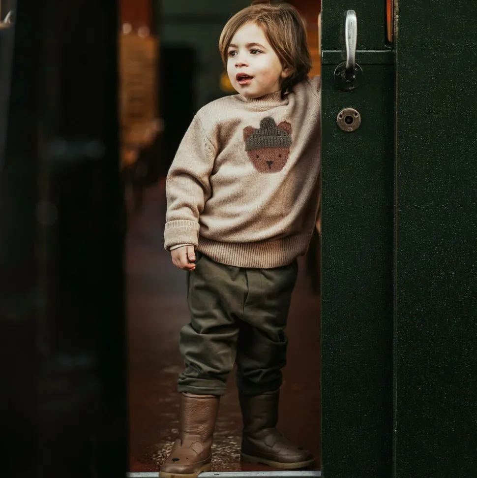 Cosy beige sweater for boys and girls by Dutch label, Donsje. Luxuriously knitted in Merino wool, this warm layering piece has an intarsia teddy bear on the front wearing a cute 3D bobble hat. The designer's logo is stitched on one cuff, signing off the look with a subtly branded touch.